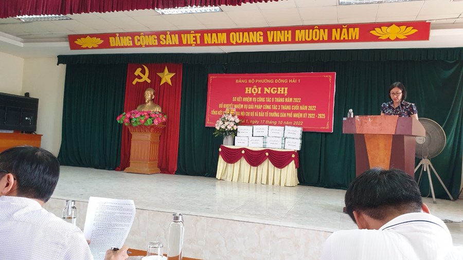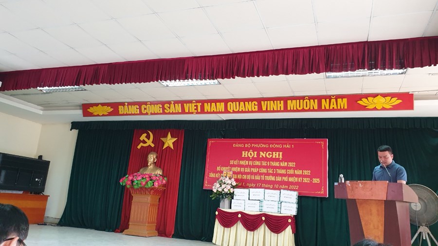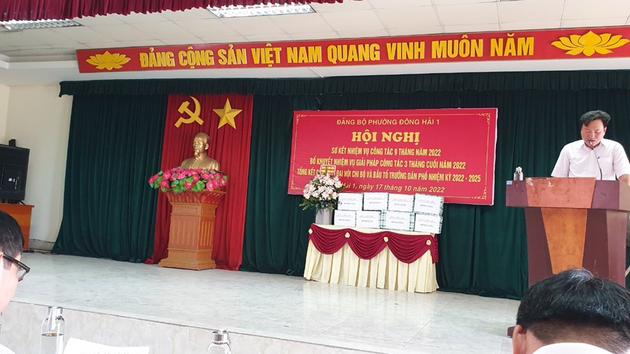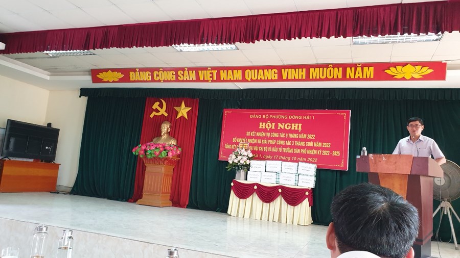 Đảng ủy phường Đông Hải 1 tổ chức Hội nghị Sơ kết nhiệm vụ công tác 9 tháng năm 2022 và bổ khuyết nhiệm vụ giải pháp công tác 3 tháng cuối năm 2022, tổng kết công tác tổ chức Đại hội chi bộ nhiệm kì 2022- 2025. Về dự và chỉ đạo Hội nghị đông chí Vũ Văn Lăng - UVBTV- trưởng ban tổ chức Quận ủy.