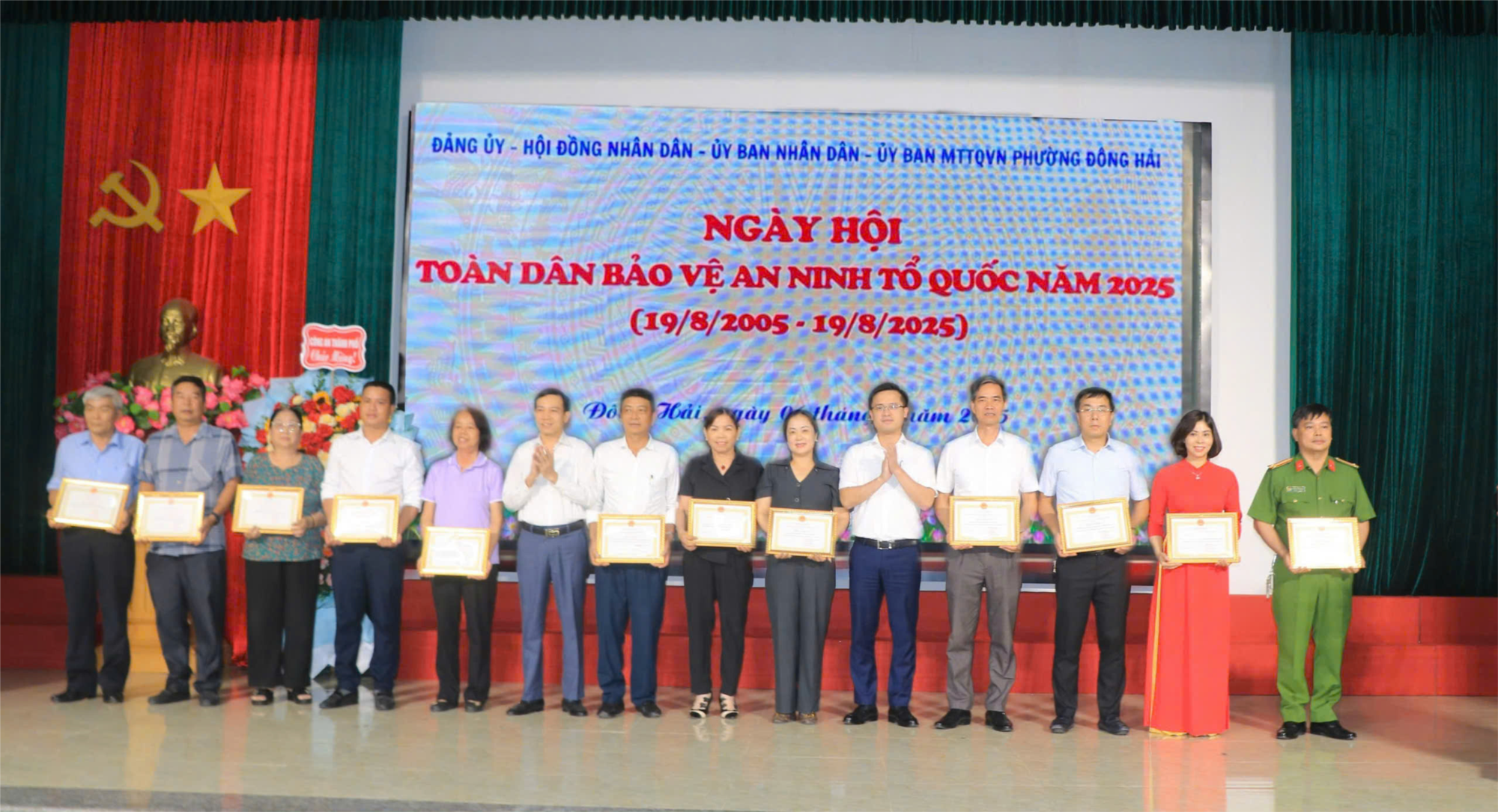 Sáng 6/8/2025, Đảng uỷ, HĐND, UBND, Uỷ ban MTTQ Việt Nam phường Đông Hải long trọng tổ chức “Ngày hội Toàn dân bảo vệ ANTQ” năm 2025. Dự Ngày hội có đại diện Uỷ ban MTTQ Việt Nam thành phố, một số phòng nghiệp vụ chức năng CATP; Đ/c Nguyễn Anh Tuấn - Bí thư Đảng ủy, Chủ tịch HĐND phường; Đồng chí Hoàng Hải Bằng - PBT Thường trực Đảng ủy phường; Đ/c Nguyễn Trọng Khiêm - Phó Bí thư Đảng uỷ, Chủ tịch UBND phường; Đ/c Đinh Minh Tâm - PCT Thường trực UBND phường; Đ/c Nguyễn Khánh Chi - Phó Chủ tịch UBND phường; Đ/c Phạm Văn Nhường - Phó Chủ tịch HĐND phường; Đ/c Phạm Công Hưng - Chủ tịch Ủy ban MTTQ Việt nam phường; Thượng tá Đào Kỳ Phong - Uỷ viên Ban Thường vụ Đảng ủy, Trưởng Công an phường; đại diện các phòng, ban, ngành, đoàn thể, đơn vị, trường học trên địa bàn phường; Ban chỉ huỵ, CBCS Công an phường; các đồng chí Bí thư Chi bộ, Tổ trưởng Tổ dân phố, Trưởng ban Ban công tác mặt trận, Tổ trưởng Tổ ANTT cơ sở; đại diện Nhân dân trên địa bàn phường cùng các tập thể, cá nhân được biểu dương, khen thưởng.
