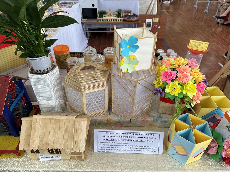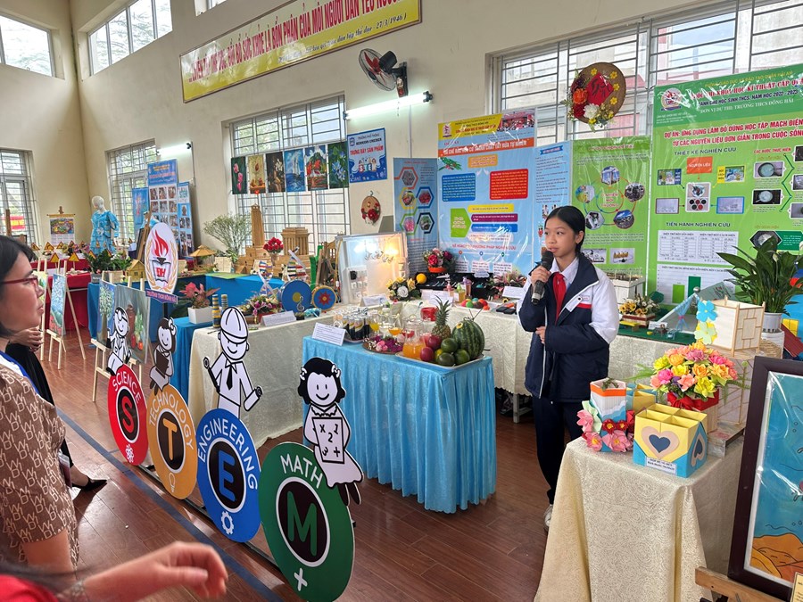 Gian trưng bày của trường THCS Đông Hải gồm các sản phẩm: Ứng dụng làm đồ dùng học tập mạch điện mềm từ các nguyên liệu đơn giản trong cuộc sống; Mô hình Hệ Mặt trời; Soda hoa quả; Mô hình lắp mạch điện sinh hoạt; Mô hình các đồ dùng làm từ vật liệu tái chế có dạng hình lăng trụ đứng; Các nhạc cụ được làm từ vật liệu tái chế. Ngoài ra, gian trưng bày của trường còn có các sản phẩm của những dự án nghiên cứu Khoa học kỹ thuật: Dự án “Tái chế rác hữu cơ thành chất tẩy rửa tự nhiên” của lớp 9A1, đây là dự án đã đạt giải Ba cấp thành phố; Dự án “Tìm hiểu nhu cầu giáo dục thể chất của học sinh trường THCS Đông Hải” của lớp 8B5; Dự án “Giải pháp góp phần cải thiện ngôn ngữ giao tiếp chưa đẹp của một số bạn học sinh trường THCS Đông Hải” của lớp 8B2.