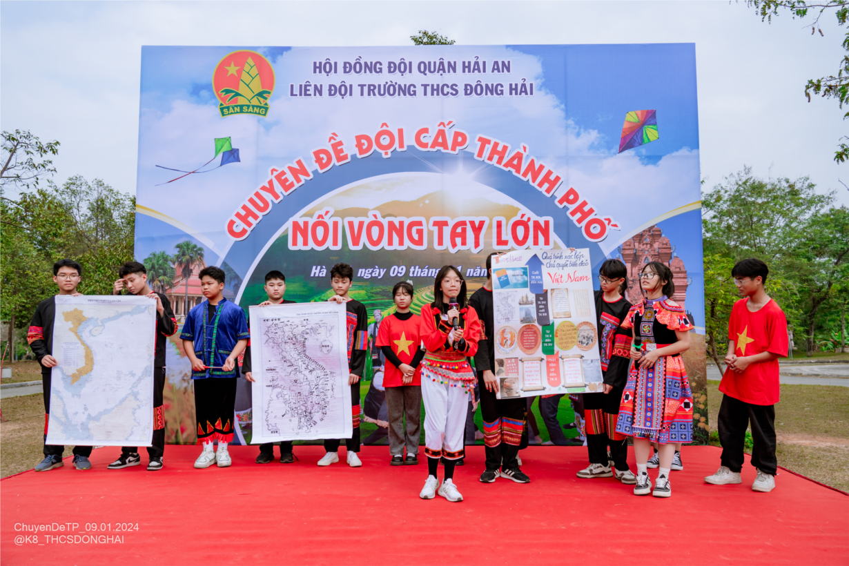Ngày 09/1/2024, Trường THCS Đông Hải tổ chức chuyên đề cấp thành phố “Nối vòng tay lớn” tại làng văn hoá các dân tộc Việt Nam -Đồng Mô, Hà Nội. Tham gia đoàn có BGH, TPT, giáo viên giảng dạy và 500 em học sinh toàn khối 8. Với nội dung xuyên suốt 3 chặng: Chặng 1: “Chúng em hành quân về miền dân tộc” các em học sinh được giao lưu tìm hiểu nét văn hóa của đồng bào các dân tộc Việt Nam, múa giao lưu với đồng bào tại làng Ba Na. Chặng 2: “Chúng em với truyền thống văn hóa dân tộc” các em tham quan chùa Khmer, Tháp Chăm, điểm đá Trường Sa, trải nghiệm làm bánh, tìm hiểu văn hóa, kiến trúc, ngôn ngữ, âm nhạc, nghề nghiệp đặc trưng tại các làng dân tộc: Tày, Nùng, Mông, Lào, Mường, Dao, Khơ mú, Thái, Tà Ôi, Xơ Đăng, Gia Rai, Cơ Tu. Chặng 3: “Nối vòng tay lớn” tại sân khấu chính các em báo cáo sản phẩm học tập trải nghiệm bằng sơ đồ tư duy, các sản phẩm bánh làm tại làng dân tộc, tiết mục múa nghệ thuật “Khoảnh khắc”, thuyết trình “Em yêu biển đảo quê hương" lớp 8B6, nhảy “Tổ quốc gọi tên mình” lớp 8B11, hát múa “Mái trường Tây Nguyên” lớp 8B3- 8B4. Hấp dẫn, kịch tính ở phần thi “Rung chuông vàng” học trò Hữu Trung lớp 8B6 đã xuất sắc vô địch rung chuông vàng. Chuyên đề kết thúc với âm nhạc bài hát “Nối vòng tay lớn- múa vũ điệu Kết Đoàn” cùng giao lưu, gắn kết với đồng bào dân tộc. Chương trình thực sự ấn tượng, hứng thú để lại dư âm trong lòng thầy cô, phụ huynh và các em học sinh trường THCS Đông Hải.