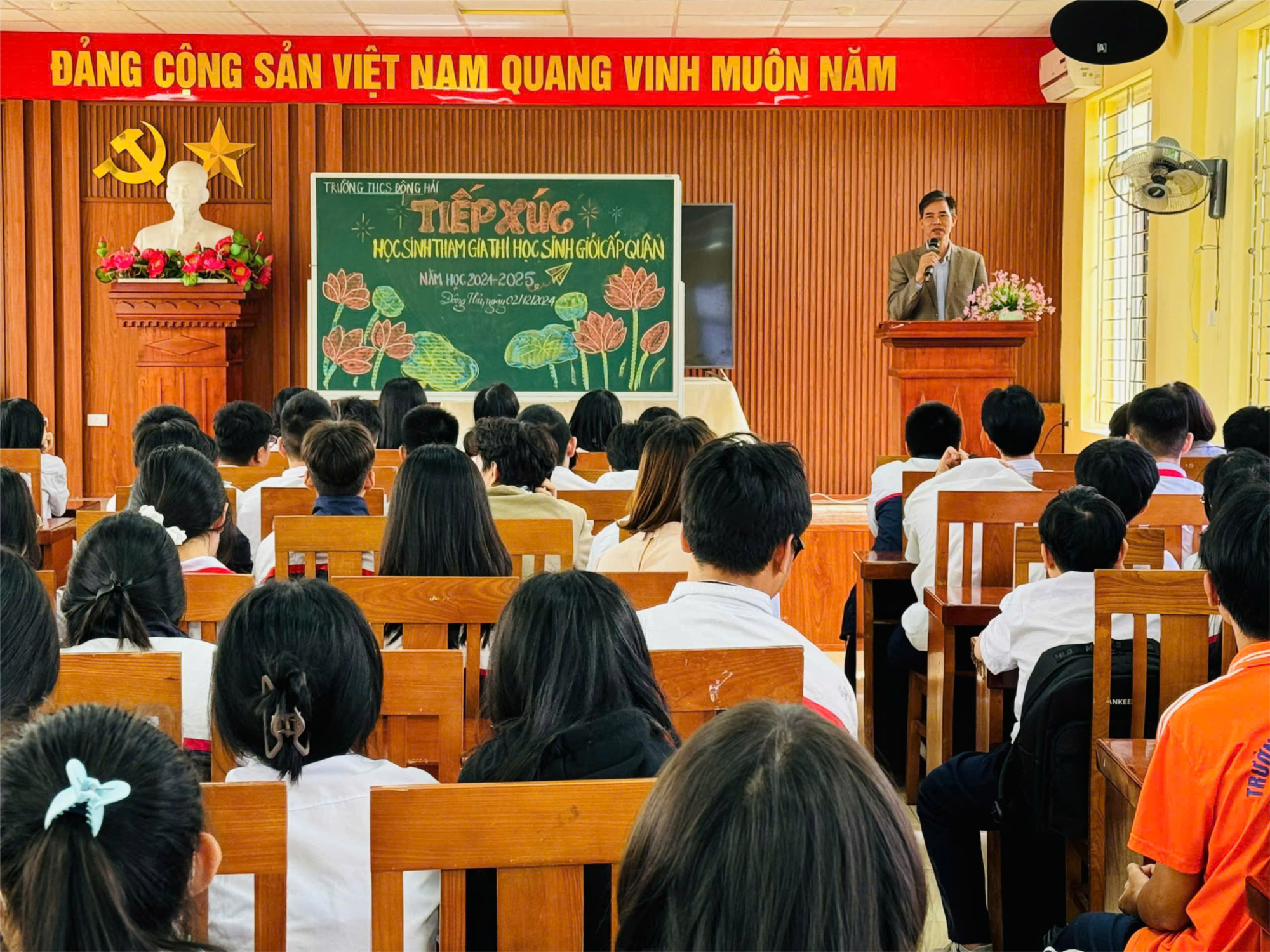 Ngày 02/12/2024, Trường THCS Đông Hải tổ chức tiếp xúc học sinh dự thi học sinh giỏi cấp quận năm học 2024-2025. Tham dự buổi tiếp xúc có thầy giáo Phạm Hồng Khánh- Hiệu trưởng nhà trường, cô giáo Nguyễn Thị Ngọc Huyền- Phó hiệu trưởng- CTCĐ, cô giáo Trần Thị Thắng- Phó HT nhà trường. Các cô giáo bồi dưỡng đội tuyển và các em HS khối 9 dự thi HSG cấp Quận năm học 2024-2025 ở các môn học: Toán, Ngữ Văn, Tiếng Anh, KHTN, Lịch sử & Địa lý, GDCD, Mĩ thuật, Công nghệ, Âm nhạc. Trong buổi tiếp xúc thầy giáo Phạm Hồng Khánh- Hiệu trưởng nhà trường đã phát biểu đánh giá cao sự nỗ lực, quyết tâm của tất cả các em học sinh tham gia thi HSG cấp Quận và ân cần dặn dò các em chuẩn bị tâm thế tốt cho kỳ thi. Lời dặn dò tận tình của thầy là nguồn động lực rất lớn giúp các em học sinh bình tĩnh, tự tin, chiến thắng tại cuộc thi HSG cấp Quận năm học 2024- 2025.