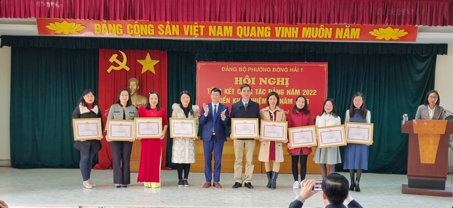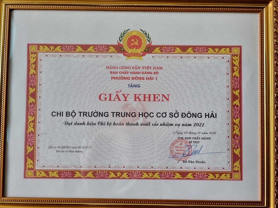 Cũng tại hội nghị, Chi bộ trường THCS Đông Hải đạt danh hiệu Chi bộ hoàn thành xuất sắc nhiệm vụ năm 2022 và 08 đồng chí Đảng viên ưu tú của Chi bộ đạt danh hiệu Đảng viên hoàn thành xuất sắc nhiệm vụ năm 2022 được nhận giấy khen của Ban chấp hành Đảng bộ phường Đông Hải 1. Các đồng chí Đảng viên ưu tú của Chi bộ trường THCS Đông Hải gồm: Đồng chí Phạm Hồng Khánh – Bí thư Chi bộ, đồng chí Nguyễn Thị Ngọc Huyền – Phó Bí thư Chi bộ, đồng chí Trần Thị Thắng – Chi ủy viên, đồng chí Nguyễn Thị Hà Giang – Chi ủy viên, đồng chí Trịnh Hải Yến – Chi ủy viên cùng các đồng chí Đồng Hải Yến, Đỗ Thái Mỹ và Nguyễn Thị Thu Hương.