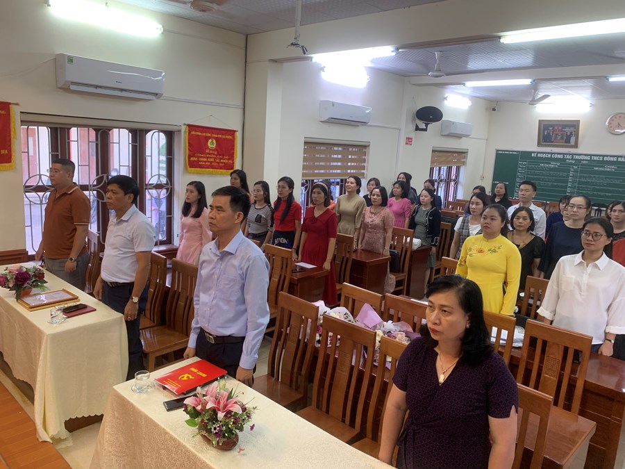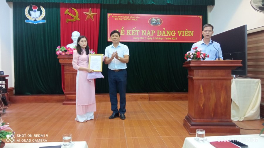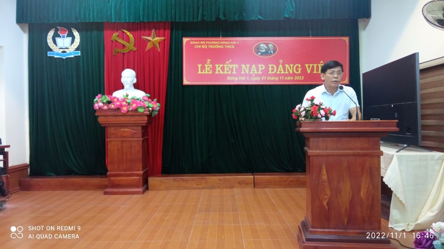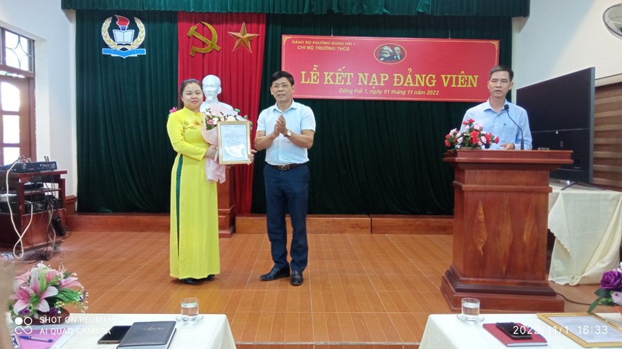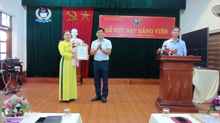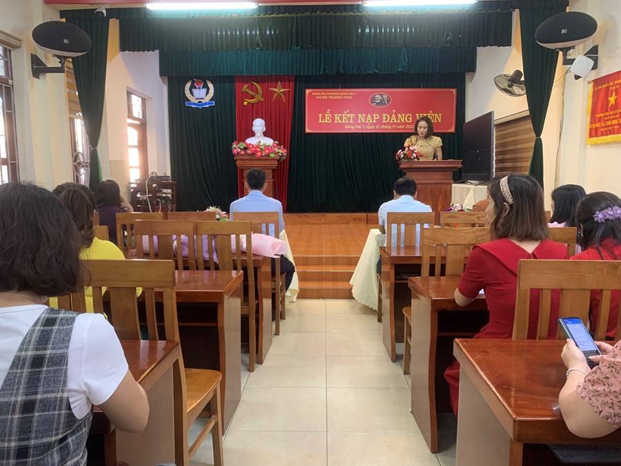 Ngày 1/11/2022, được sự đồng ý của Ban Thường vụ Đảng ủy phường Đông Hải 1, Chi uỷ chi bộ Trường THCS Đông Hải tổ chức Lễ kết nạp Đảng viên cho các quần chúng: Nguyễn Thu Trang và Nguyễn Thủy Hồ. Căn cứ Điều 4 chương I Điều lệ Đảng cộng sản Việt Nam; Thực hiện Nghị quyết Đại hội Chi bộ Trường THCS Đông Hải, nhiệm kỳ 2022 – 2025 về công tác xây dựng phát triển Đảng. Trải qua quá trình phấn đấu, tu dưỡng, rèn luyện, học tập của quần chúng Nguyễn Thu Trang, quần chúng Nguyễn Thủy Hồ, cũng như sự giáo dục, dìu dắt giúp đỡ của cấp ủy, của các đ/c Đảng viên trong chi bộ và của đảng viên chính thức được phân công bảo đảm và giúp đỡ. Đến nay, Ban thường vụ Quận ủy Hải An đã ra các quyết định kết nạp Đảng viên cho các quần chúng Nguyễn Thu Trang, Nguyễn Thủy Hồ. Về dự buổi lễ kết nạp Đảng viên có đồng chí Nguyễn Văn Kỳ- Phó chủ tịch hội đồng nhân dân phường Đông Hải 1 và đồng chí Nguyễn Huy Hiệp- Bí thư Đoàn phường Đông Hải 1; Các đồng chí ban giám hiệu nhà trường cùng 42 đồng chí đảng viên đã có mặt đông đủ. Trong chương trình, đồng chí Bí thư chi bộ phát biểu giao nhiệm vụ cho đảng viên mới, nói rõ quyền và nhiệm vụ của người đảng viên và phân công đảng viên chính thức tiếp tục theo dõi, giúp đỡ đảng viên mới trong thời gian dự bị 12 tháng.