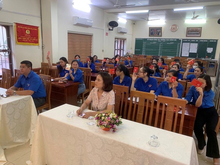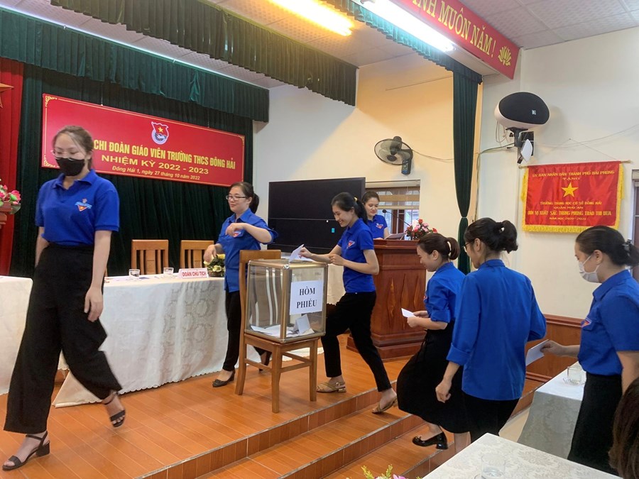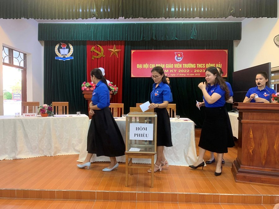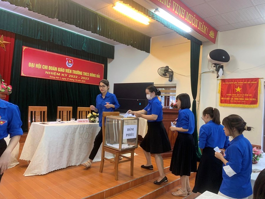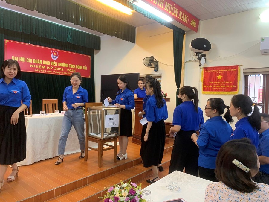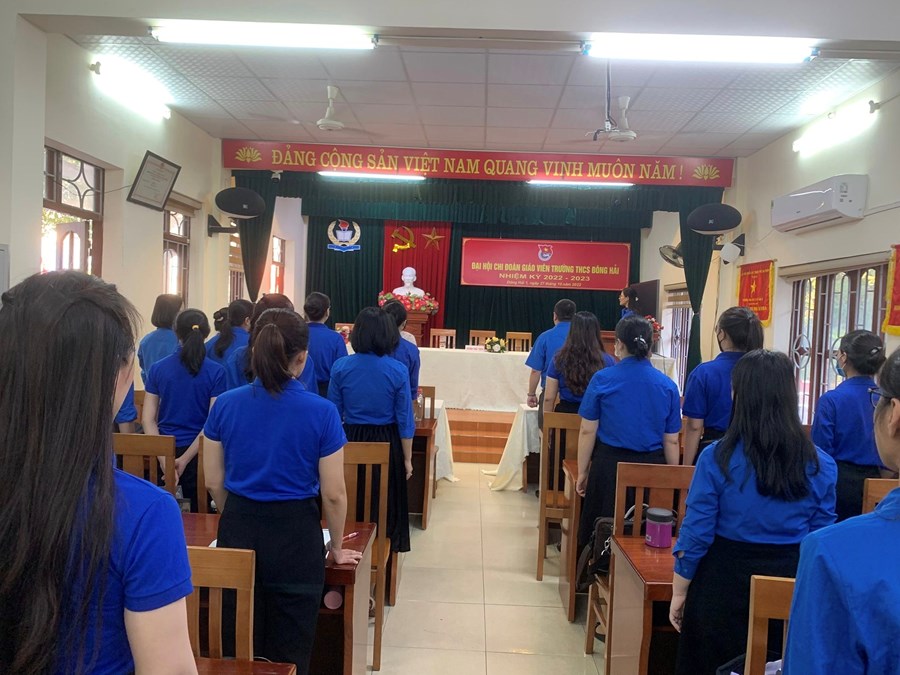 Căn cứ Điều lệ Đoàn TNCS Hồ Chí Minh và Hướng dẫn thực hiện Điều lệ Đoàn TNCS Hồ Chí Minh. Thực hiện hướng dẫn số 02/HD-ĐTN của BCH quận Đoàn Hải An về việc tổ chức Đại hội Đoàn khối trường học, nhiệm kỳ 2022-2023. Chiều 27/10/2022 chi Đoàn giáo viên trường THCS Đông Hải long trọng tổ chức "Đại hội chi Đoàn giáo viên trường THCS Đông Hải, nhiệm kỳ 2022-2023". Chi Đoàn vinh dự được đón tiếp đ/c Nguyễn Huy Hiệp- BT Đoàn phường Đông Hải 1, đ/c Trần Thị Thắng- Phó Hiệu trưởng nhà trường về dự và chúc mừng thành công của Đại hội. Đại hội bầu ra BCH Chi Đoàn gồm 05 đồng chí: Đ/c Nguyễn Thu Trang, đ/c Phùng Thị Thùy Linh, đ/c Nguyễn Hoàng Phương Phương, đ/c Nguyễn Thị Thủy, đ/c Trần Kim Thoa. Chúc mừng đ/c Nguyễn Thu Trang đã giữ chức vụ BT chi Đoàn giáo viên, nhiệm kỳ 2022-2023.