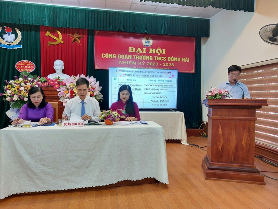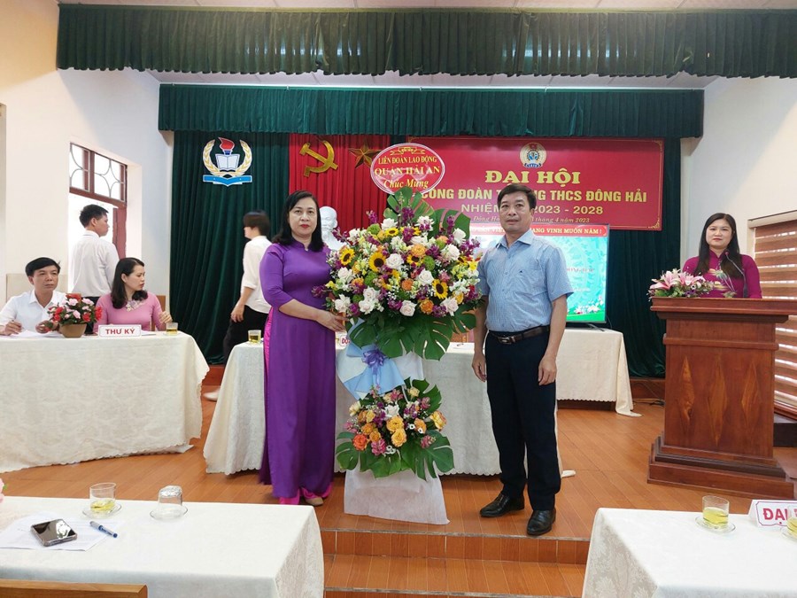 Hôm nay, ngày 13/4/2023 Công đoàn Trường THCS Đông Hải long trọng tổ chức Đại hội nhiệm kỳ 2023 – 2028.Về dự và chỉ đạo Đại hội có đồng chí Vũ Hữu Nguyện- Uỷ viên BCH LĐLĐ Thành phố, Quận ủy viên,Chủ tịch LĐLĐ Quận Hải An.