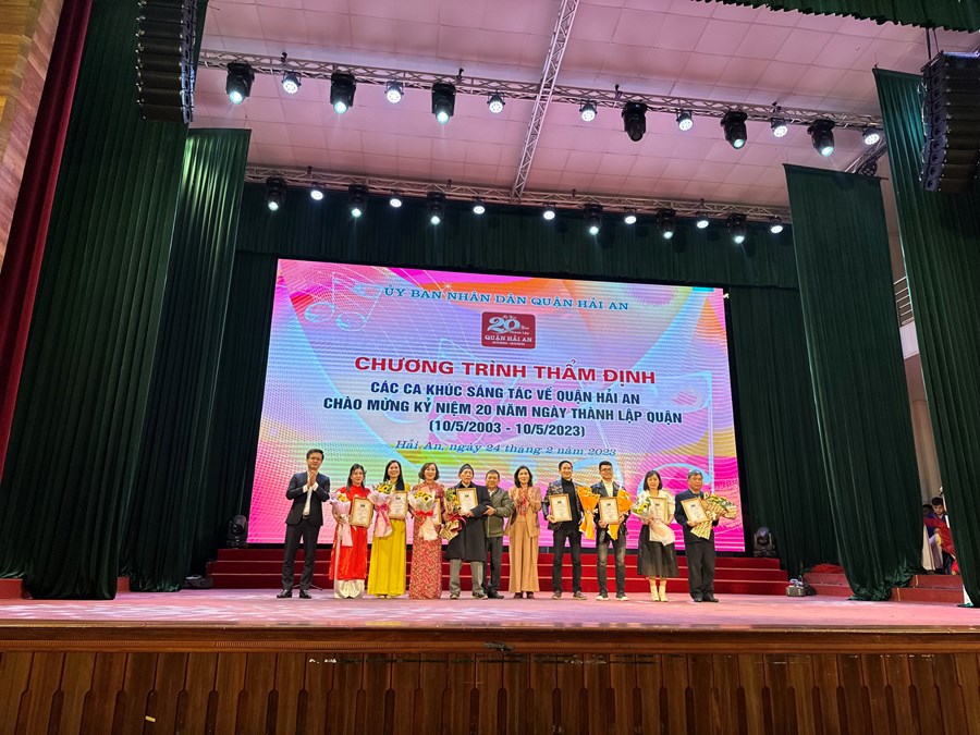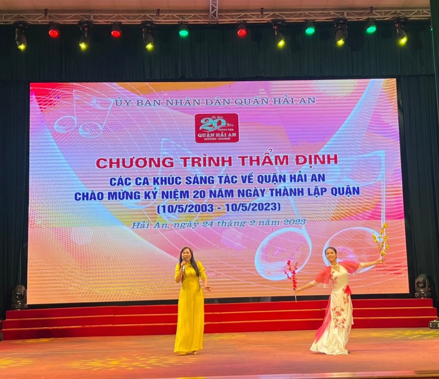 Thực hiện kế hoạch số 141/KH-UBND ngày 17/06/2022 của UBND quận Hải An về việc tổ chức phát động sáng tác nghệ thuật thơ, ca khúc chào mừng kỉ niệm 20 năm ngày thành lập quận Hải An (10/05/2003 – 10/05/2023), ngày 24/02/2023 Quận Hải An tổ chức chương trình thẩm định các ca khúc sáng tác về quận. Đến dự có các đc Nguyễn Văn Tuấn - bí thư Quận Uỷ, đc Nguyễn Anh Tuấn – phó bí thư Quận Uỷ, đc Dương Đình Ổn – chủ tịch Quận. 21 ca khúc được thể hiện thành công, để lại ấn tượng sâu sắc trong lòng người nghe. Trường THCS Đông Hải vinh dự đóng góp bài hát “Hải An – lời ru quê hương” do cô giáo Thu Hằng sáng tác và biểu diễn. Dưới đây là một số hình ảnh của chương trình: