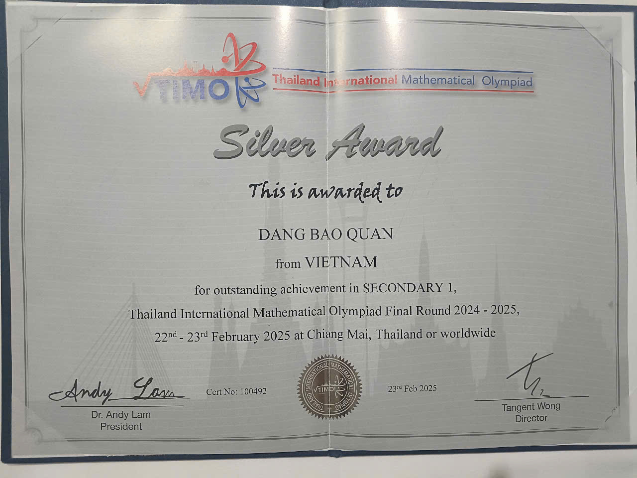 Từ ngày 21/2/2025 đến ngày 23/2/2025 vòng quốc tế kỳ thi Olympic Toán học quốc tế TIMO 2024-2025 chính thức diễn ra dưới 2 hình thức: Thi trực tuyến (online) tại Việt Nam hoặc thi tập trung tại Chiang Mai- Thái Lan. Với ngôn ngữ đề thi Tiếng Anh. Đề thi gồm 30 câu hỏi, trả lời đúng mỗi câu được 5 điểm. Tổng số điểm tối đa được 150 điểm trong vòng thời gian thi 120 phút. Em Đặng Bảo Quân lớp 7C2 trường THCS Đông Hải đã đạt điểm cao tại cuộc thi giành giải Bạc Quốc tế. Chúc mừng em đã rất xuất sắc đạt được thành tích cao, với niềm đam mê toán học chúc em sẽ tiếp tục chinh phục thành công các cuộc thi Olympic quốc gia và quốc tế.