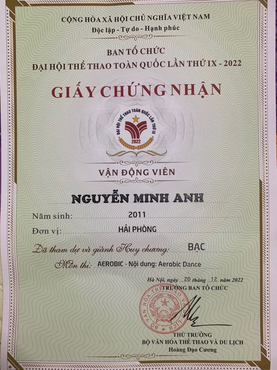 Trong khuôn khổ Đại hội Thể thao toàn quốc lần thứ IX năm 2022, ngày 20/12, tại Khu Liên hiệp thể thao Hải Thành, quận Dương Kinh đã diễn ra Môn thi đấu Chung kết và trao giải thể dục Aerobic. Trong đoàn vận động viên thành phố Hải Phòng có một vận động viên nhỏ tuổi nhất là Nguyễn Minh Anh, hiện là học sinh lớp 6D2 trường THCS Đông Hải, quận Hải An. Là một học sinh giỏi toàn diện, Nguyễn Minh Anh còn theo đuổi đam mê Aerobic, chăm chỉ tập luyện, nỗ lực không ngừng. Dù tuổi còn nhỏ, Nguyễn Minh Anh sớm đã bộc lộ những tố chất của một vận động viên tài năng chuyên nghiệp, e nhận được sự ủng hộ lớn lao từ gia đình, thầy cô, bạn bè; niềm tin tưởng cao từ Ban huấn luyện thể thao Thành phố. Tại chung kết Đại hội thể thao lần thứ IX 2022, Nguyễn Minh Anh đã thi đấu hết mình và giành Huy chương Bạc nội dung Aerobic Dance, Huy chương Đồng nội dung Nhóm 5 người, góp phần vào thành công rực rỡ của Đoàn vận động viên Hải Phòng môn thể dục Aerobic: xếp thứ Ba toàn quốc. Đây là một thành tích đáng tự hào của thành phố Cảng, của Quận Hải An, góp phần viết tiếp trang vàng truyền thống của trường THCS Đông Hải - nơi ươm mầm cho những tài năng nhí, trường học hạnh phúc, thân thiện, học sinh được phát triển toàn diện.