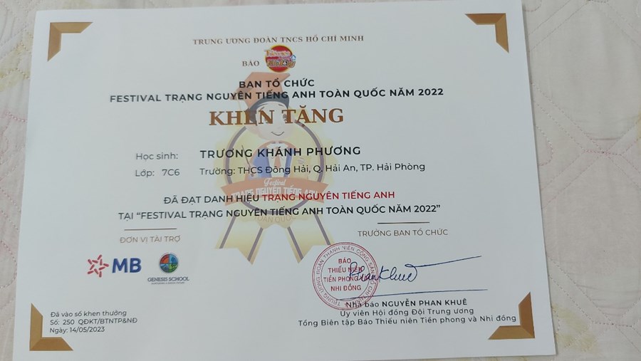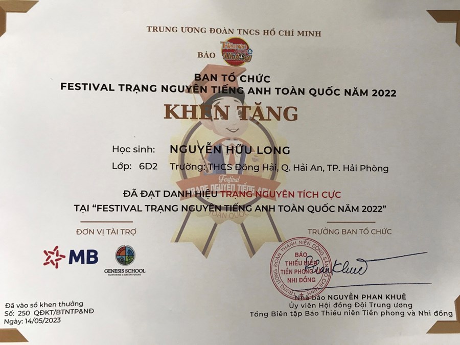 Ngày 13/5-15/5/2023, tại thủ đô Hà Nội đã diễn ra Festival Trạng Nguyên Tiếng Anh toàn quốc. Tham gia sự kiện đặc biệt này, trường THCS Đông Hải vinh dự có 2 học sinh đạt giải: Em Trương Khánh Phương lớp 7C6 đạt giải nhất Trạng Nguyên Tiếng Anh, em Nguyễn Hữu Long lớp 6D2 đạt giải Trạng Nguyên tích cực. Chúc mừng 2 học trò nhỏ đã thi hết mình và tỏa sáng trong cuộc thi tiếng Anh toàn quốc.