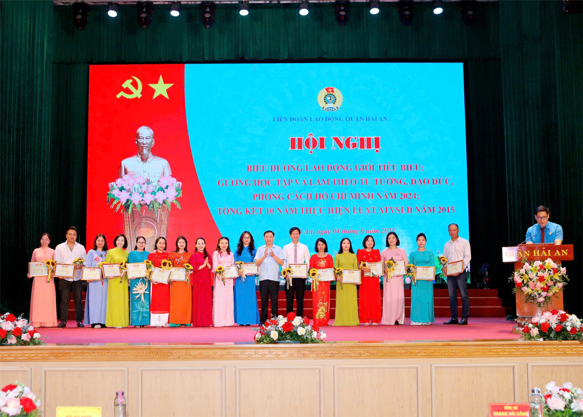 Ngày 04/6/2025, Liên đoàn Lao động quận Hải An tổ chức Hội nghị biểu dương lao động giỏi tiêu biểu năm 2024; tập thể, cá nhân điển hình trong học tập và làm theo tư tưởng, đạo đức, phong cách Hồ Chí Minh năm 2024; tổng kết 10 năm Luật An toàn, vệ sinh lao động năm 2015, biểu dương khen thưởng các tập thể, cá nhân có thành tích xuất sắc trong thực hiện tốt Luật An toàn, vệ sinh lao động và phong trào Xanh - Sạch - Đẹp, Bảo đảm An toàn, vệ sinh lao động.