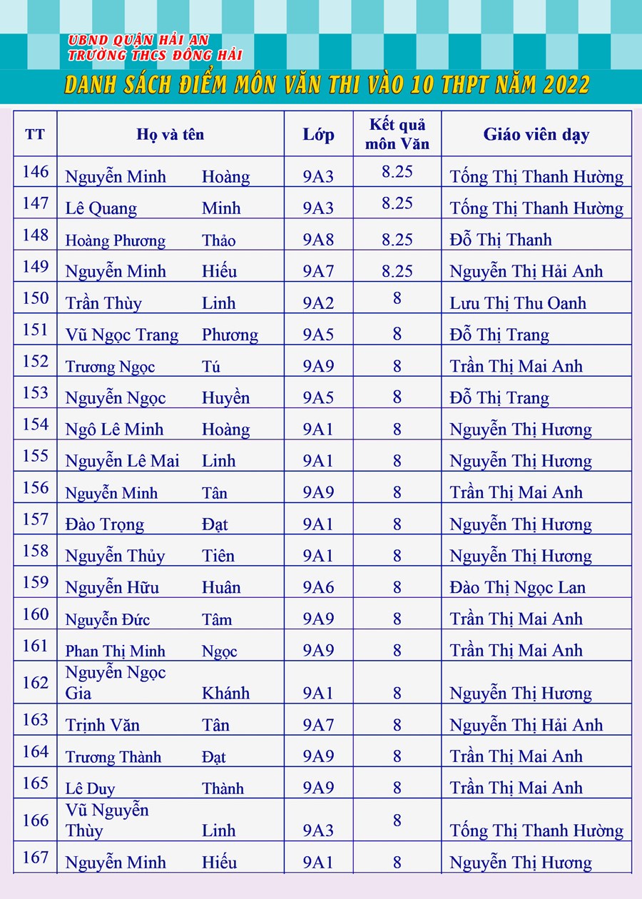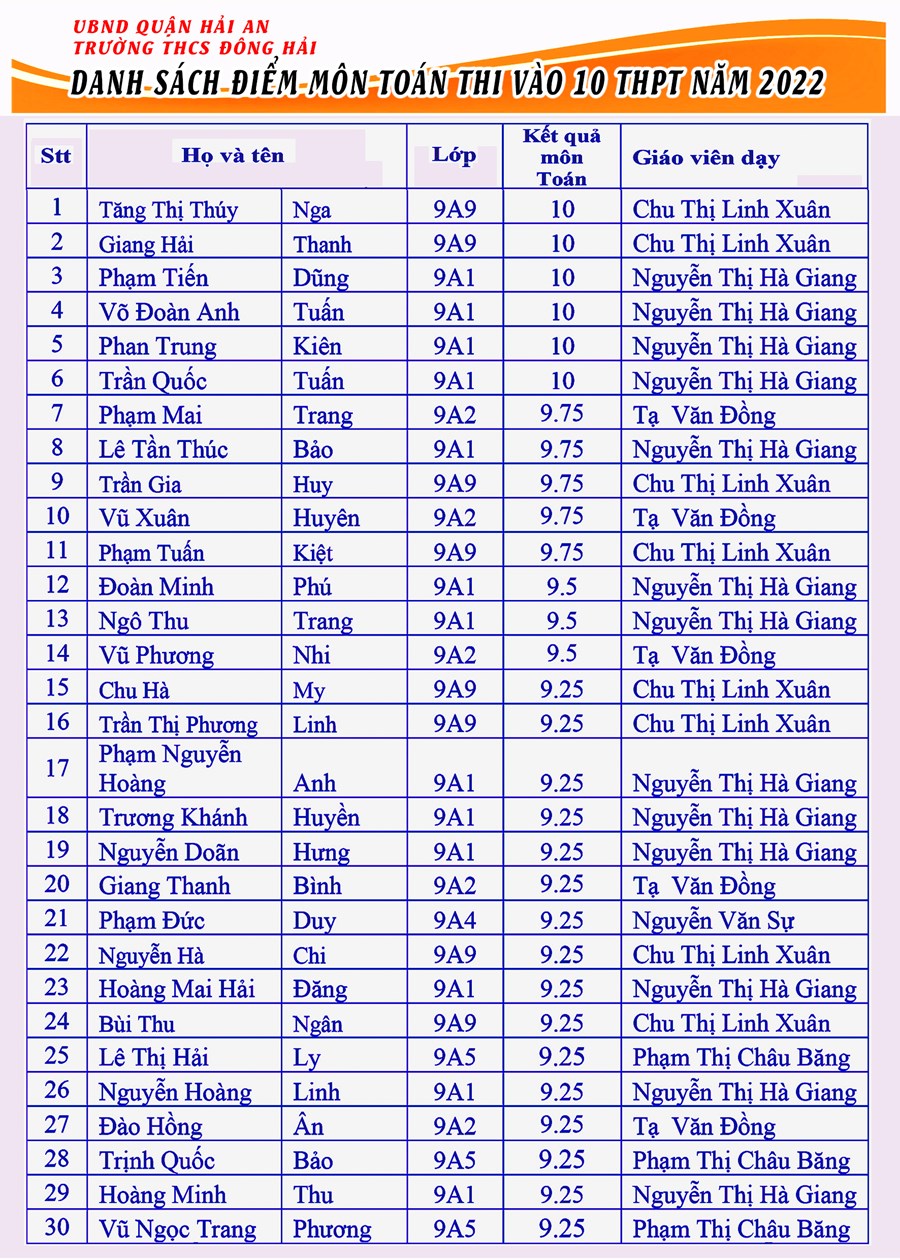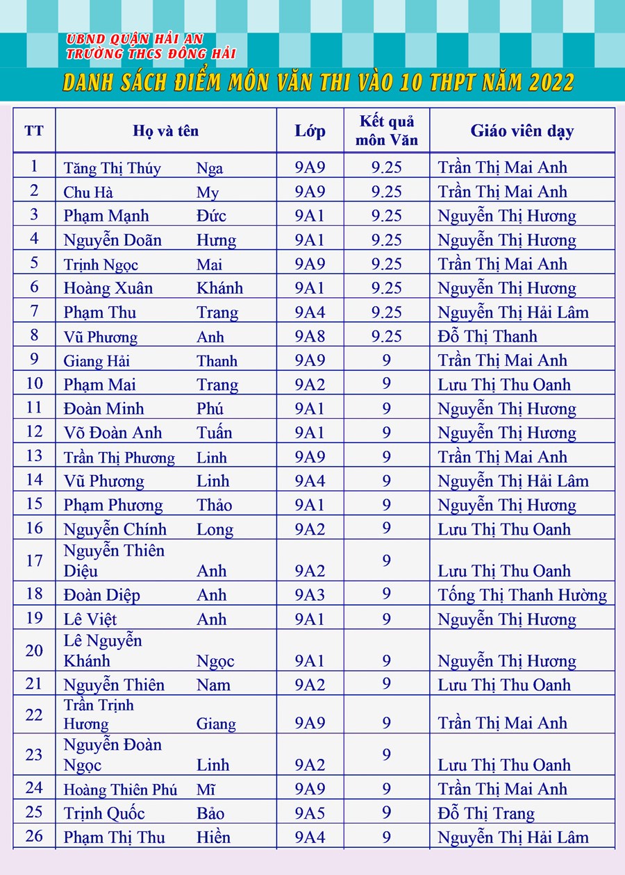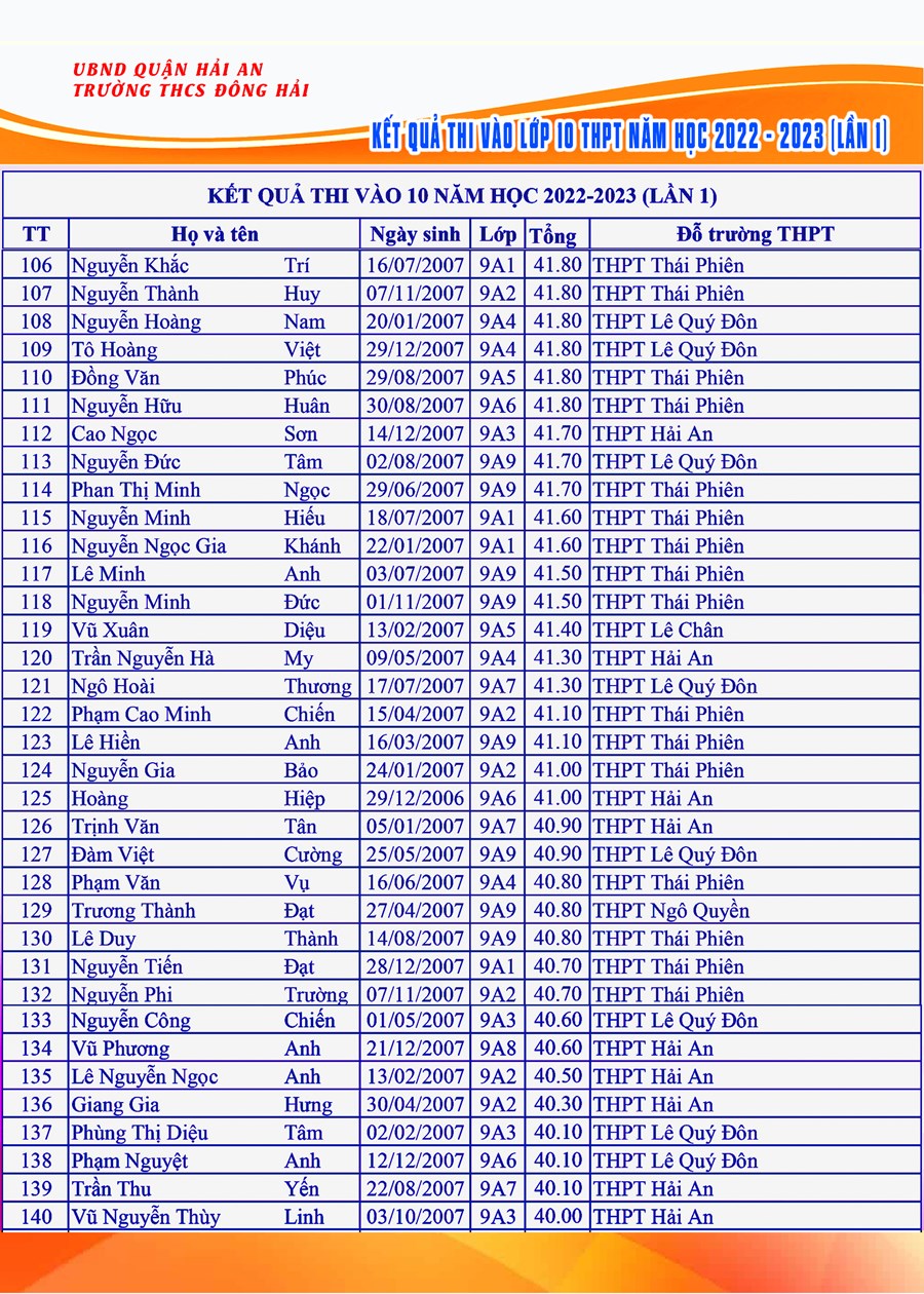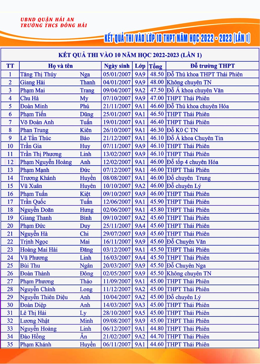 Chúc mừng ngành Giáo dục quận Hải An năm thứ 5 liên tiếp dẫn đầu toàn thành phố trong kết quả tuyển sinh vào lớp 10 THPT năm học 2022-2023! Góp vào thành tích rực rỡ này có sự đóng góp đáng kể của thầy và trò trường THCS Đông Hải với những con số thật ấn tượng!