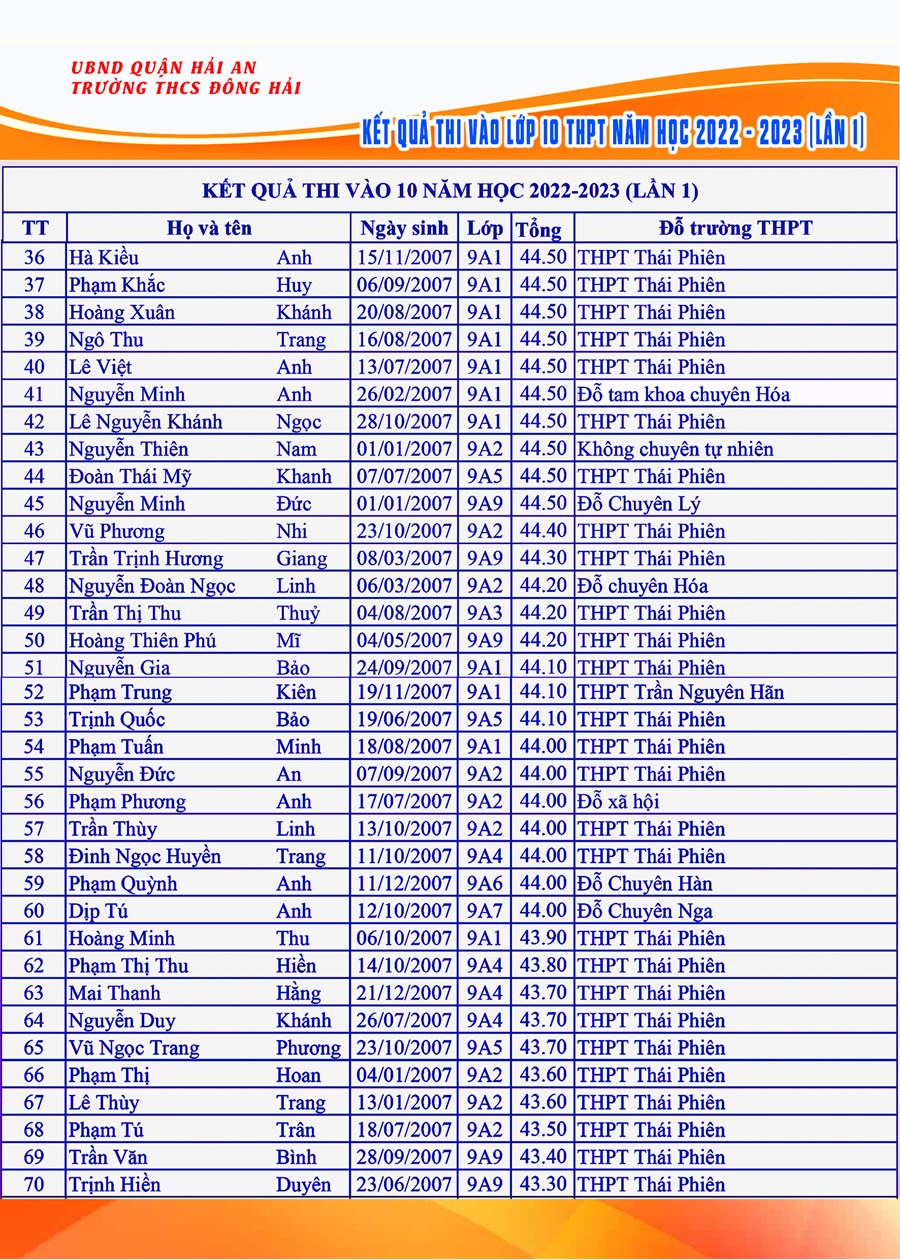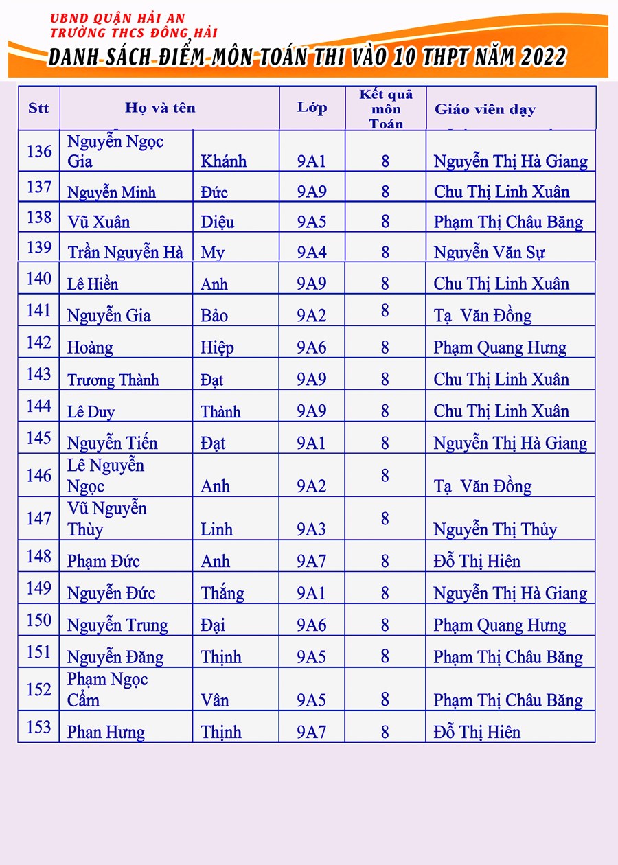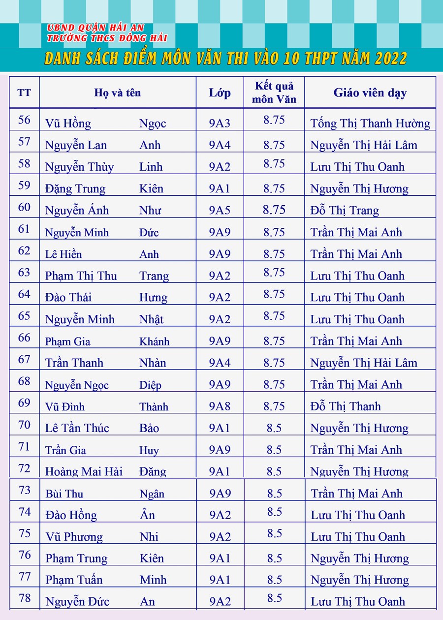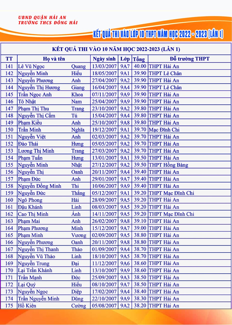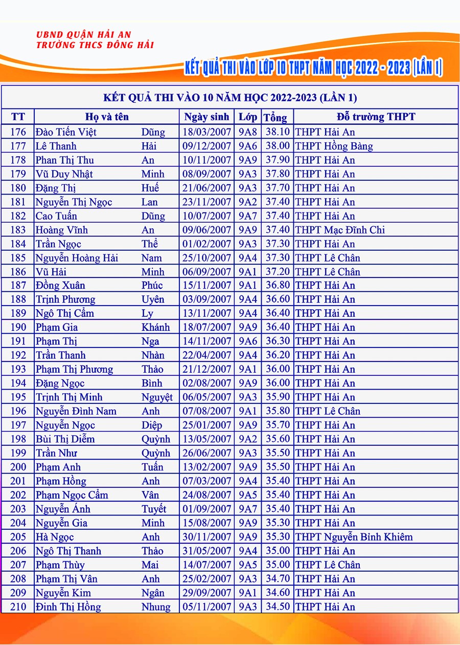 Chúc mừng ngành Giáo dục quận Hải An năm thứ 5 liên tiếp dẫn đầu toàn thành phố trong kết quả tuyển sinh vào lớp 10 THPT năm học 2022-2023! Góp vào thành tích rực rỡ này có sự đóng góp đáng kể của thầy và trò trường THCS Đông Hải với những con số thật ấn tượng!