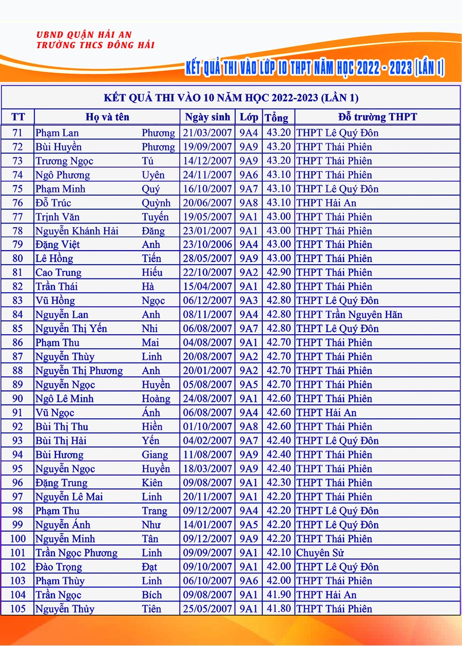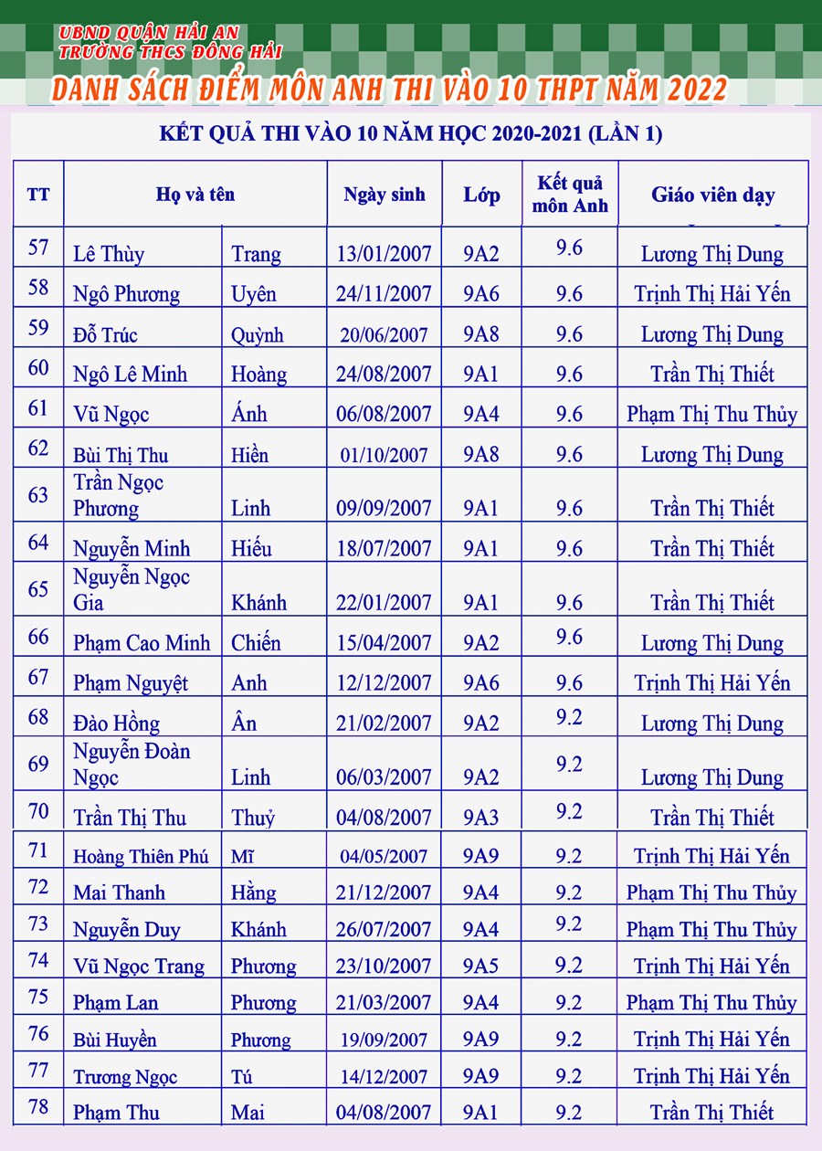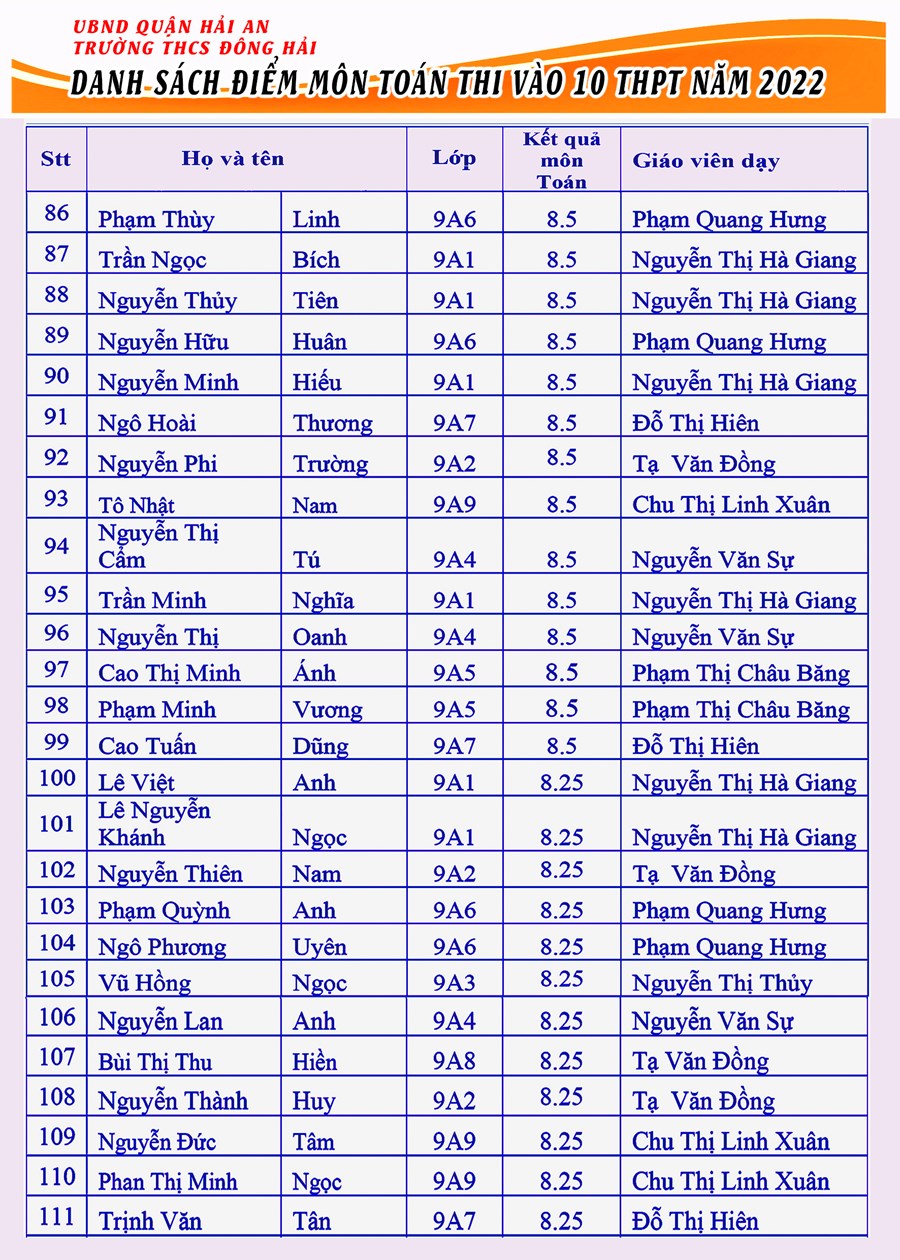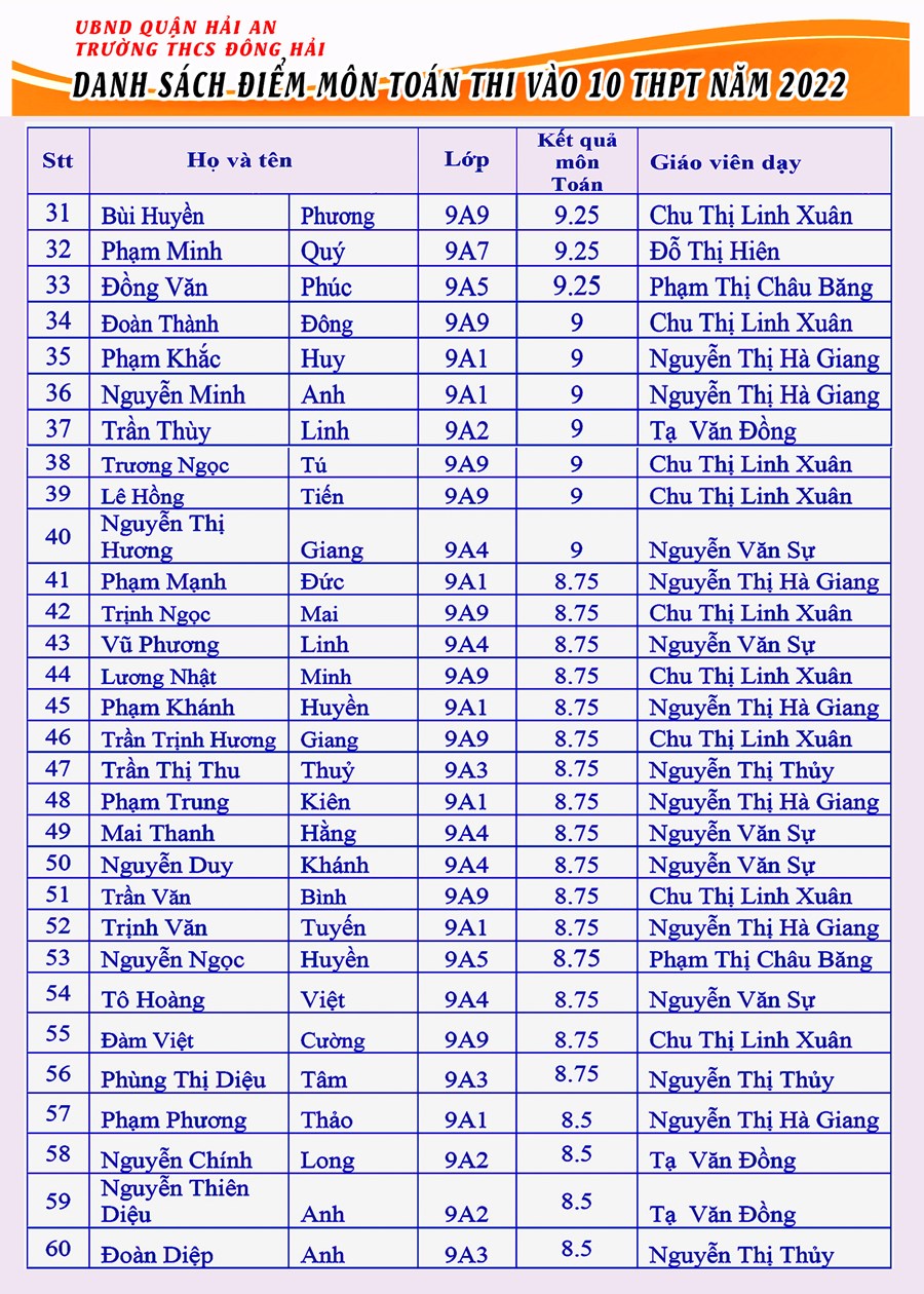 Chúc mừng ngành Giáo dục quận Hải An năm thứ 5 liên tiếp dẫn đầu toàn thành phố trong kết quả tuyển sinh vào lớp 10 THPT năm học 2022-2023! Góp vào thành tích rực rỡ này có sự đóng góp đáng kể của thầy và trò trường THCS Đông Hải với những con số thật ấn tượng!