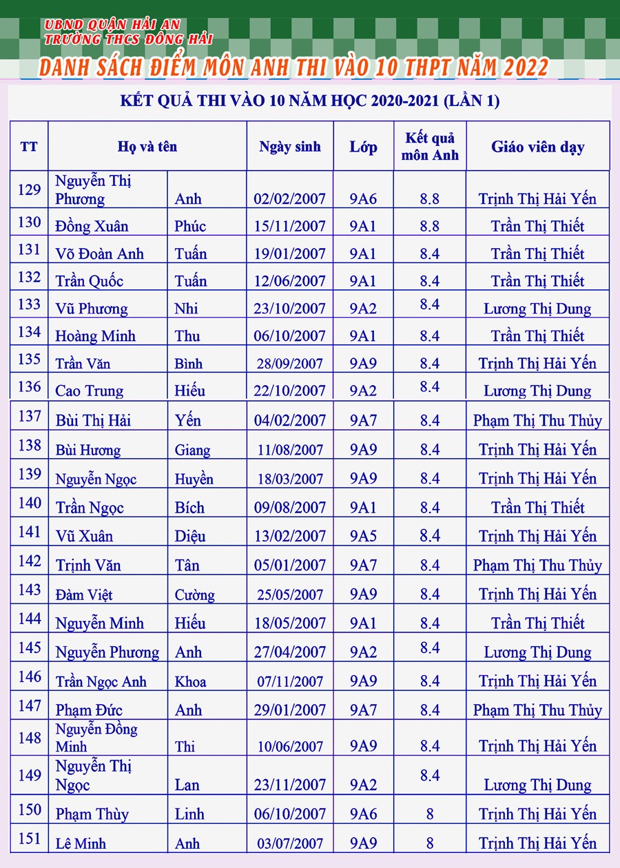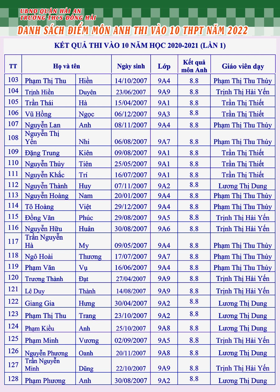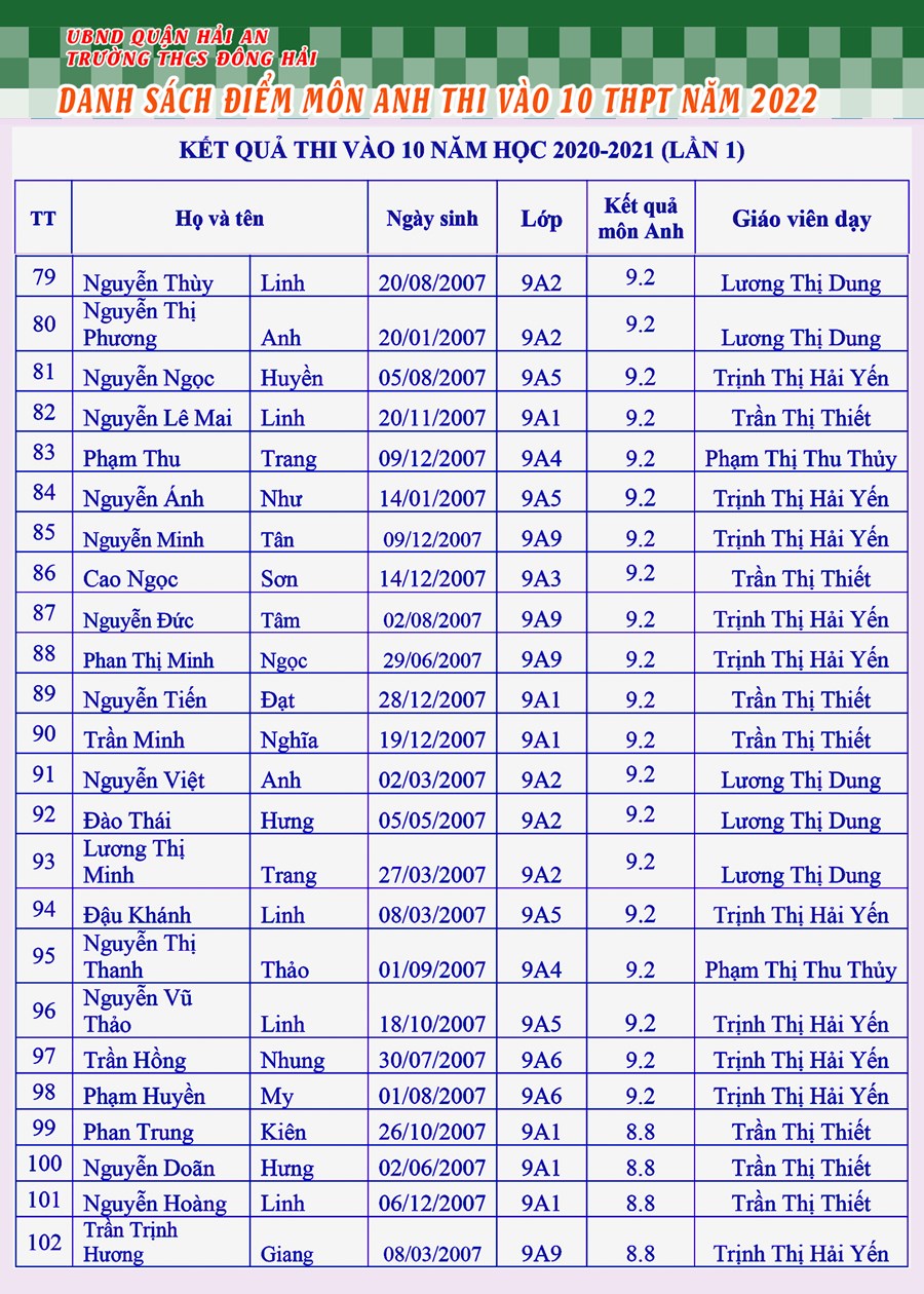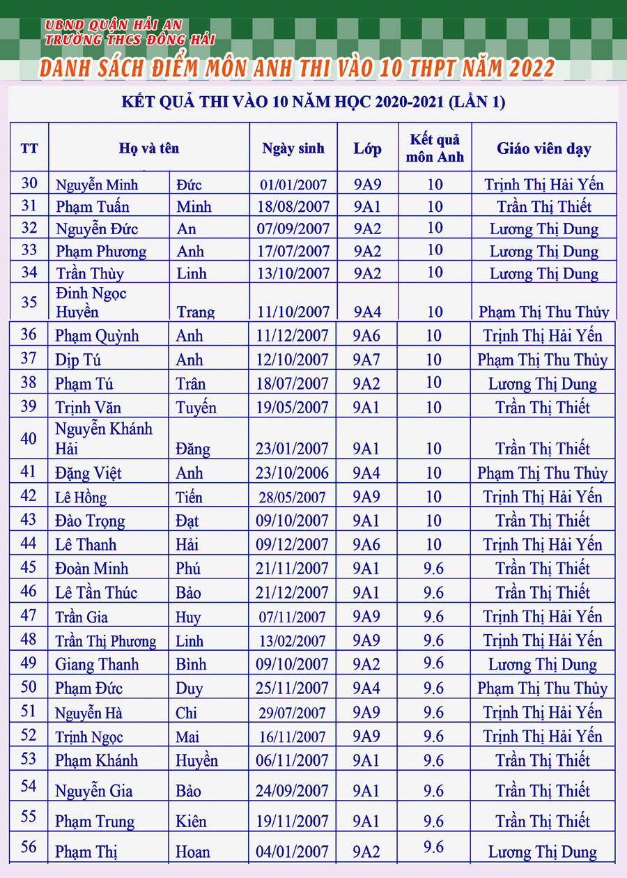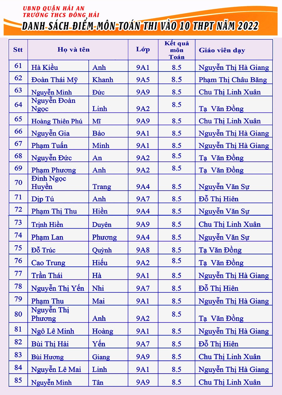 Chúc mừng ngành Giáo dục quận Hải An năm thứ 5 liên tiếp dẫn đầu toàn thành phố trong kết quả tuyển sinh vào lớp 10 THPT năm học 2022-2023! Góp vào thành tích rực rỡ này có sự đóng góp đáng kể của thầy và trò trường THCS Đông Hải với những con số thật ấn tượng!