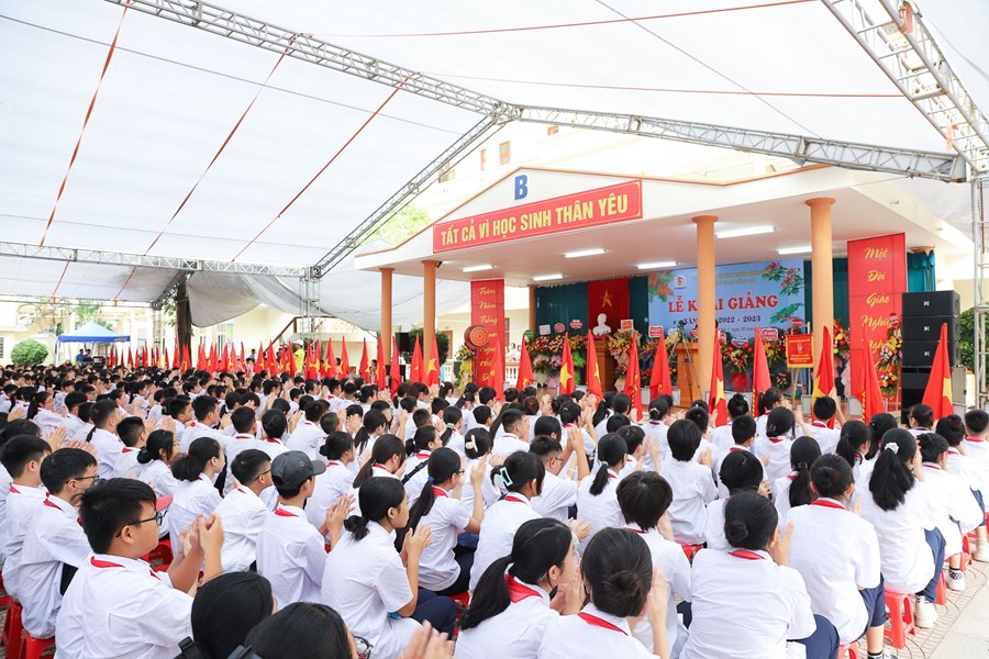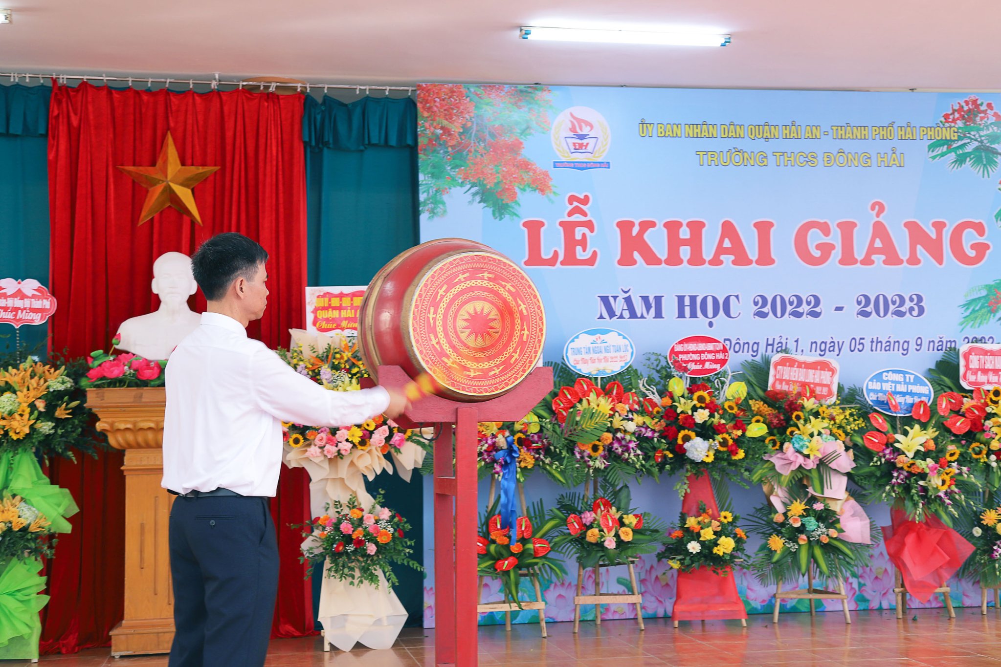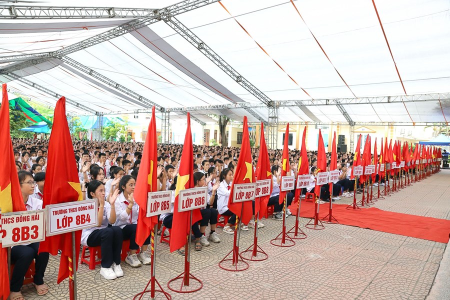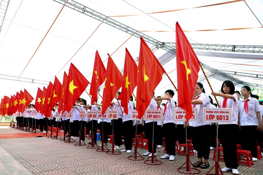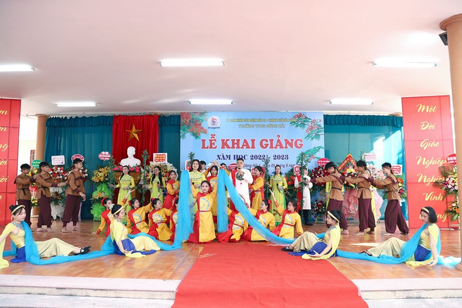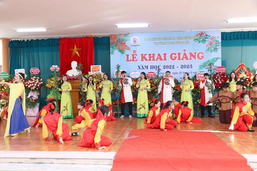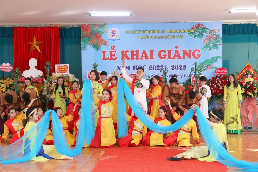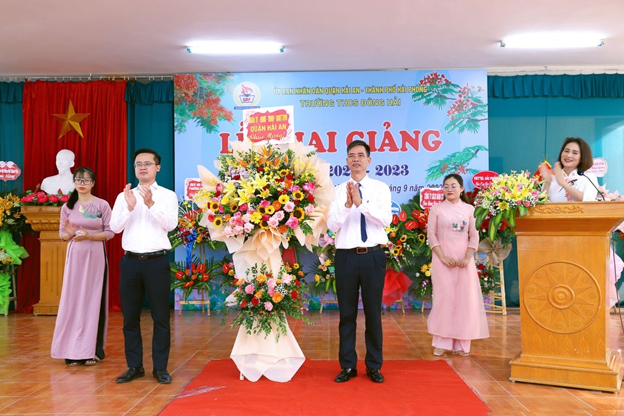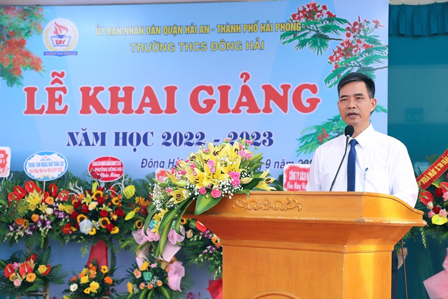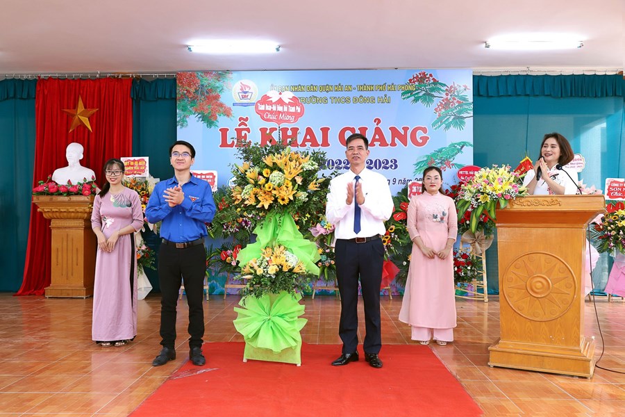 Hòa cùng 24 triệu học sinh, sinh viên và hàng vạn các thầy giáo, cô giáo trên mọi miền tổ quốc trong ngày vui toàn dân đưa trẻ đến trường, hôm nay sáng ngày 5/9/2022 thầy và trò trường THCS Đông Hải long trọng tổ chức Lễ khai giảng năm học mới 2022 - 2023. Về dự chỉ đạo, động viên và tặng cờ đơn vị xuất sắc dẫn đầu công tác Đội và phong trào thiếu nhi năm học 2021 -2022 có các đồng chí Lê Khắc Nguyên Anh - phó bí thư thường trực thành đoàn, phó chủ tịch Hội đồng đội thành phố, đồng chí Nguyễn Anh Tuấn - Phó bí thư thường trực quận ủy Hải An, các đồng chí lãnh đạo các phòng ban Thành đoàn, các phòng ban, tổ chức chính trị quận Hải An, Đảng ủy, HĐND, UBND, các ban ngành phường Đông Hải 1, Đông Hải 2, Các đơn vị Kết nghĩa Lữ đoàn 273 Quân khu 3, Nhà máy X70, Đồn Biên phòng Tràng Cát, Hội gia đình nhà giáo, Thường trực Ban đại diện CMHS nhà trường, Ban chi hội 13 lớp 6. Cùng 91 cán bộ, giáo viên, nhân viên và 2239 Học sinh toàn trường về dự đông đủ, lễ khai giảng diễn ra trong tiết trời thu nắng đẹp, không khí vui tươi, phấn khởi, an toàn, tiết kiệm, nhà trường vinh danh 20 học sinh đỗ vào trường chuyên Trần Phú và 01 học sinh đỗ thủ khoa trường THPT Thái Phiên, các thầy cô giáo có thành tích xuất sắc trong công tác ôn thi vào 10 THPT và trường chuyên Trần Phú. Sau đây là một số hình ảnh tiêu biểu về không khí khai giảng tại trường.