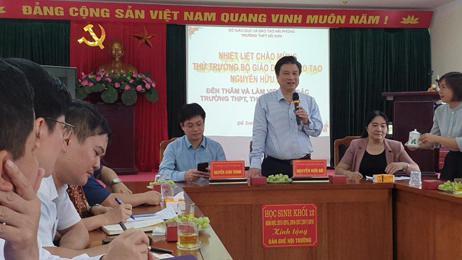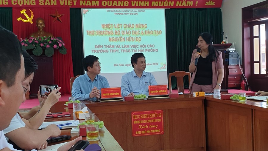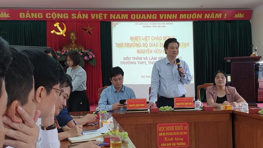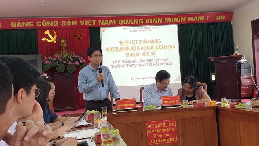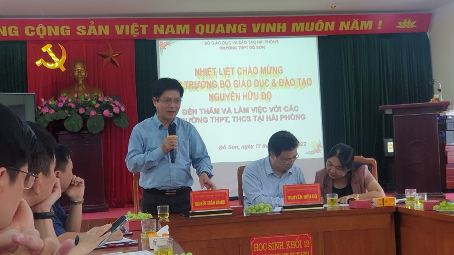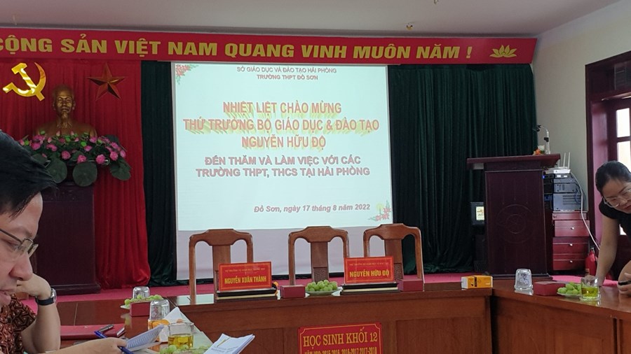 Sáng 17.8.2022 tại trường THPT Đồ Sơn được vinh dự đón đồng chí thứ trưởng Bộ Giáo dục và Đào tạo, đồng chí Nguyễn Xuân Thành Vụ trưởng Vụ Giáo dục trung học về làm việc, Đồng chí Nguyễn Hữu Độ thứ trưởng Bố GD và ĐT, Sở Giáo dục Hải Phòng có đồng chí Phạm Thị Thu Hà trưởng phòng Giáo dục trung hoc, đại diện các trường THPT, các trường THCS báo cáo quá trình thực hiện chương trình Giáo dục 2018 đối với lớp 6, 7 và lớp 10 tại Hải Phòng.