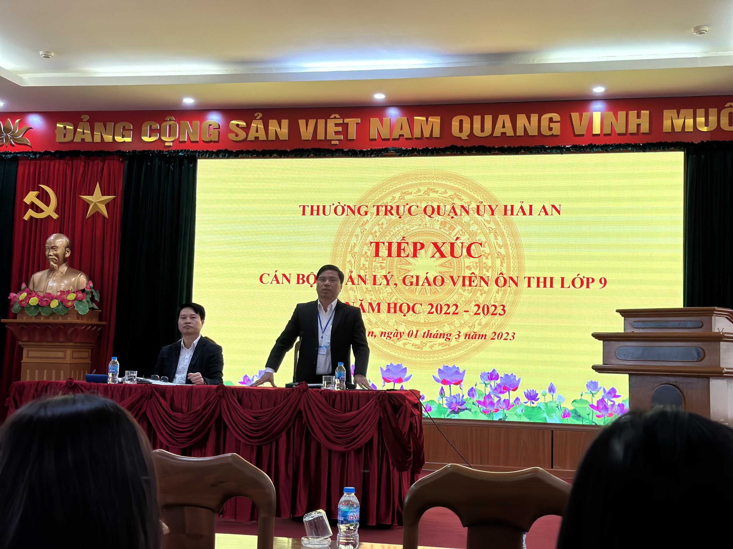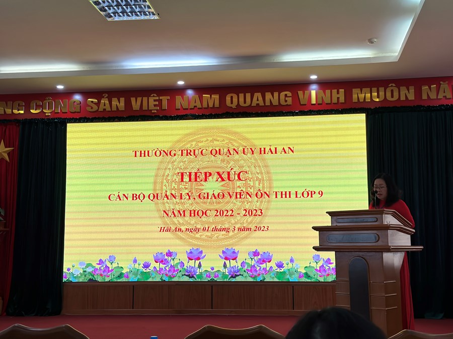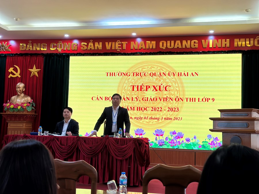 Liên tục trong nhiều năm liên tiếp, Quận Hải An luôn có kết quả thi vào 10 đứng đầu toàn thành phố. Để có được thành công đó phải kể đến sự quan tâm, chỉ đạo sát sao của các cấp lãnh đạo. Chính vì vậy chiều 01/03/2023 Thường trực Quận uỷ tổ chứ tiếp xúc cán bộ quản lý, giáo viên ôn thi lớp 9 toàn quận. Các đồng chí lãnh đạo đã lắng nghe những tâm tư, nguyện vọng, đề xuất của các thầy cô và kịp thời chỉ đạo cũng như động viên thầy cô cố gắng hết mình cho mục tiêu phía trước. Buổi tiếp xúc thực sự xúc động, ý nghĩa, tạo động lực cho các thầy cô lan toả nhiệt huyết tới các em học sinh. Các thầy cô cũng có dịp chia sẻ, học hỏi kinh nghiệm ôn thi từ đồng nghiệp.