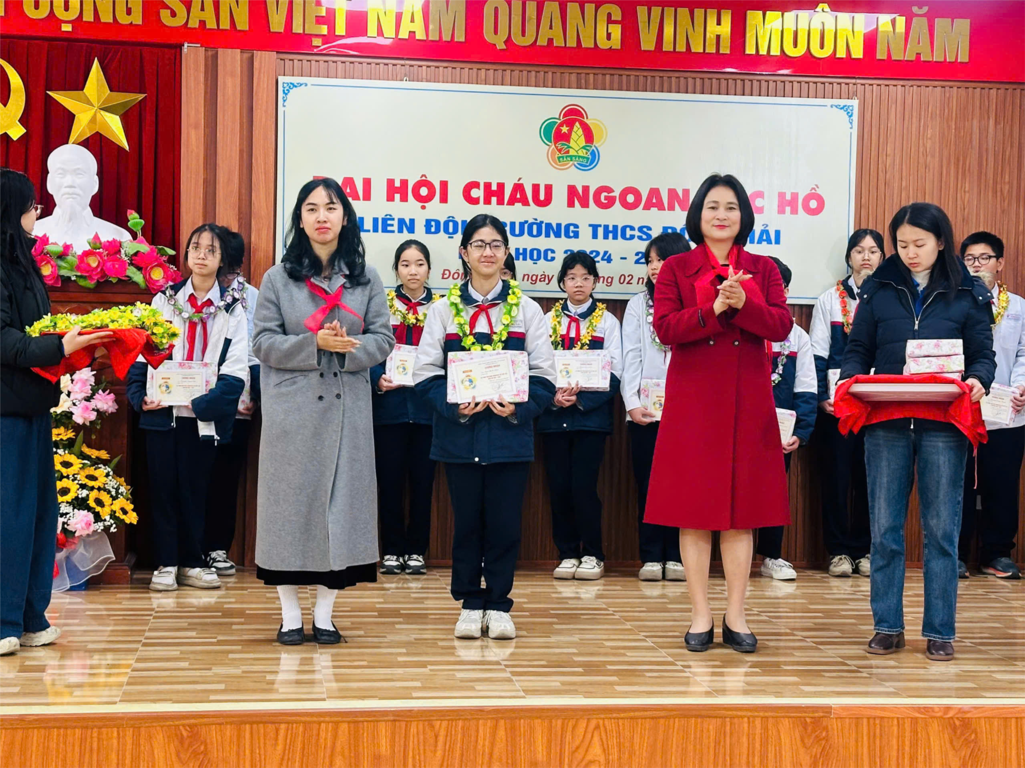 Hòa chung trong không khí vui mừng phấn khởi của thiếu nhi cả nước hướng tới chào mừng Đại hội Đảng các cấp, chào mừng kỉ niệm 135 năm ngày sinh Bác Hồ kính yêu và các ngày lễ lớn của dân tộc, sáng ngày 24/02/2025, Liên đội trường THCS Đông Hải tổ chức Đại hội Cháu ngoan Bác Hồ năm học 2024 – 2025. Đại hội vinh dự chào đón: Chị Vũ Phương Thảo- Cán bộ Quận Đoàn, chị Nguyễn Thị Phương Thảo - Bí thư Đoàn phường Đông Hải 2. Cô giáo Trần Thị Thắng – Phó BT Chi Bộ- Phó Hiệu trưởng nhà trường. Các cô giáo chủ nhiệm và 94 em Đội viên tiêu biểu, đại diện cho 2220 đội viên toàn Liên đội.