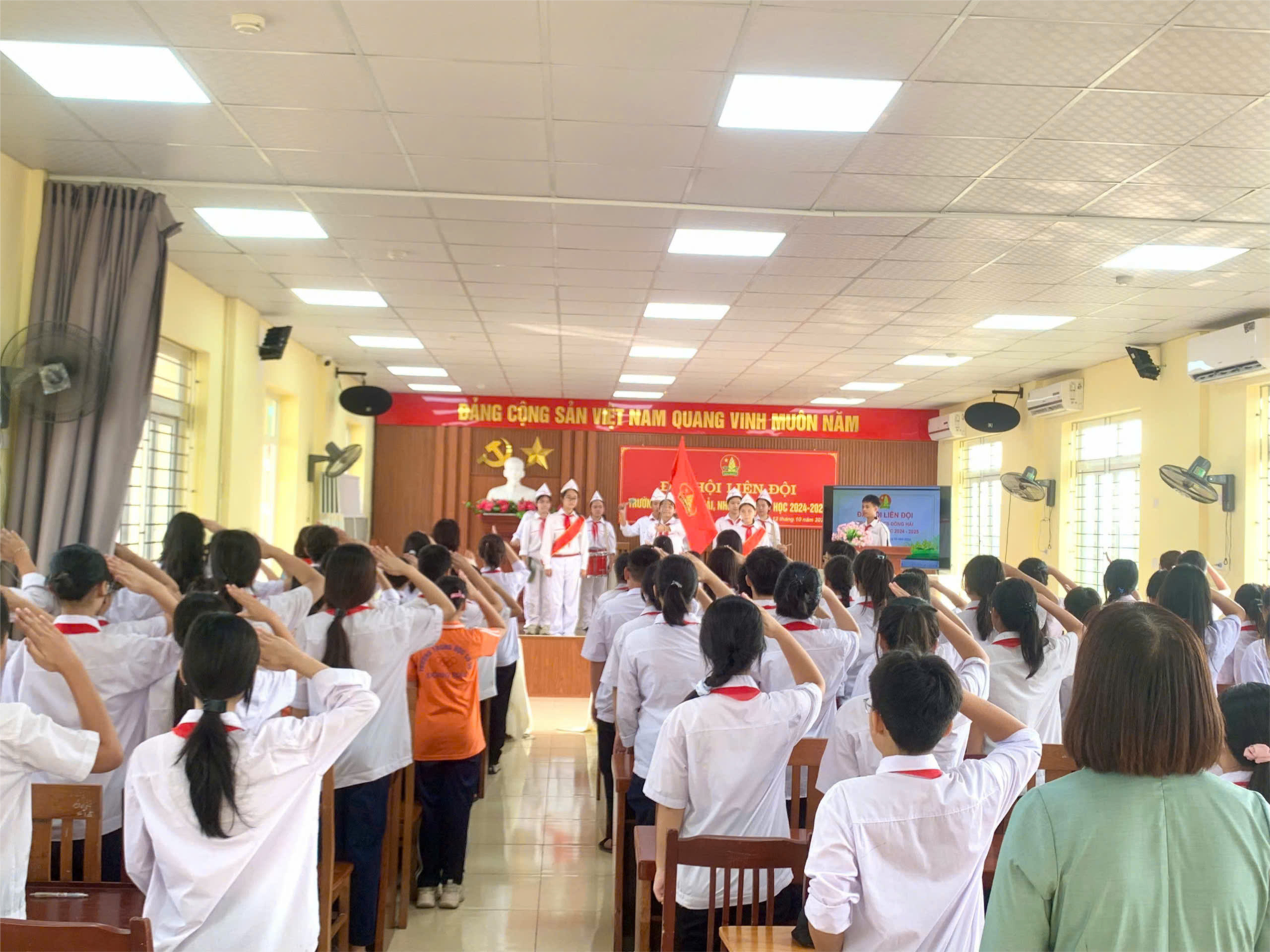 Sáng ngày 12/10/2024 Đại hội Liên Đội trường THCS Đông Hải nhiệm kỳ năm học 2024-2025 đã thành công tốt đẹp. Đại hội vinh dự được đón tiếp đồng chí Vũ Phương Thảo- Cán bộ Quận Đoàn, đ/c Nguyễn Thị Phương Thảo- Bí thư Đoàn phường Đông Hải 2. Về phía nhà trường có cô giáo Trần Thị Thắng- Phó HT, giáo viên Tổng phụ trách, chi đoàn giáo viên, GV phụ trách chi đội cùng 94 đội viên tiêu biểu đến từ 47 chi đội. Sau báo cáo tổng kết năm học 2023-2024, đại hội tiếp tục đề ra phương hướng nhiệm kỳ năm học 2024-2025. Đại hội cùng thảo luận tham luận “Xây dựng Chi Đội 3 tốt” của lớp 8B12; Tham luận “Học tập hiệu quả để ôn thi vào lớp 10” lớp 9A6. Bầu ban chỉ huy liên đội là 17 bạn đội viên năng động, nhiệt tình, có khả năng điều hành triển khai các nội dung, phong trào của Đội. Đại hội được diễn ra trang trọng, tạo không khí thi đua sôi nổi cho các em đội viên trong toàn liên đội.