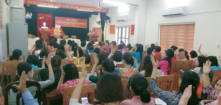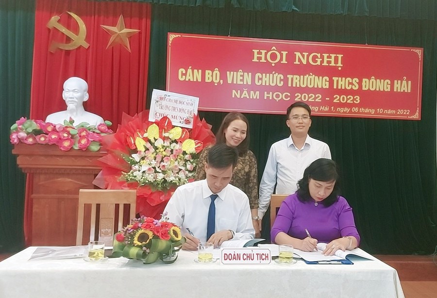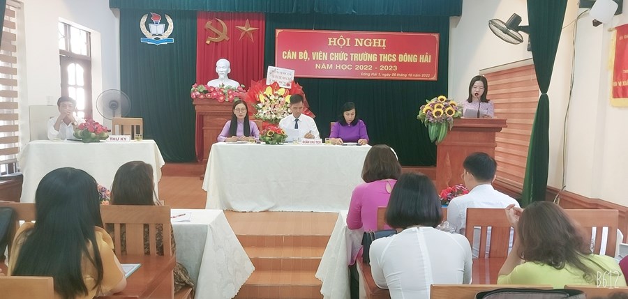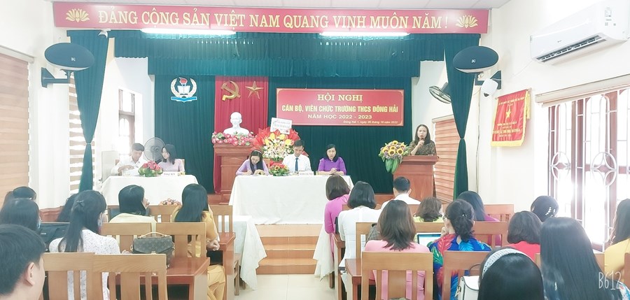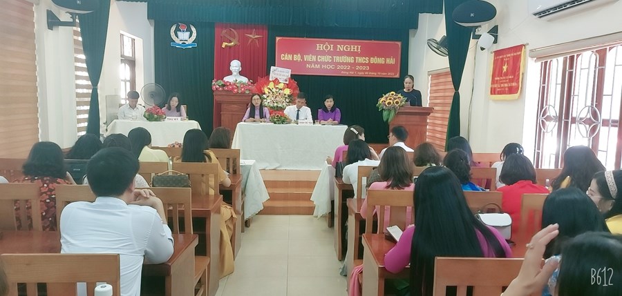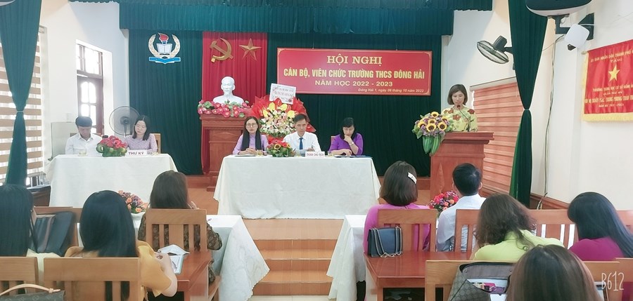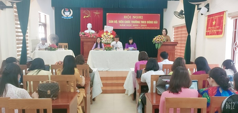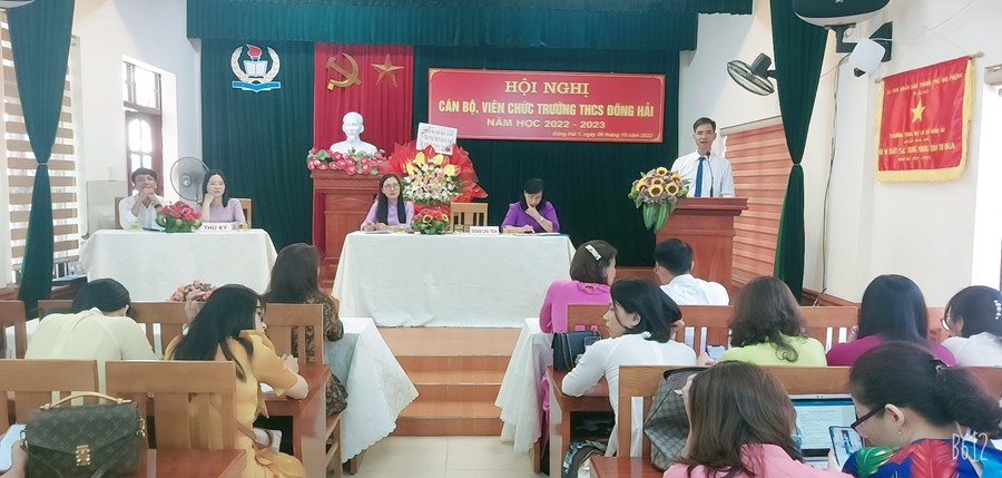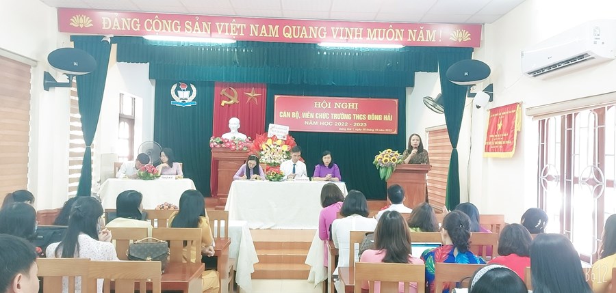 Ngày 06 tháng 10 năm 2022, Trường THCS Đông Hải- quận Hải An long trọng tổ chức Hội nghị cán bộ, viên chức năm học 2022– 2023. Hội nghị rất vinh dự được tiếp đón đồng chí Nguyễn Thị Thanh Hường- Phó chủ tịch Liên đoàn lao động quận về tham dự, phát biểu ý kiến chỉ đạo rất sát sao, tâm huyết; cũng như sự có mặt của các đại biểu đại diện Hội cha mẹ học sinh, Hội gia đình giáo viên nhà trường đến tặng hoa chúc mừng. Hội nghị đã được nghe báo cáo kết quả thực hiện nhiệm vụ của nhà trường năm học 2021 - 2022; phương hướng, nhiệm vụ năm học 2022 - 2023; báo cáo kết quả phong trào thi đua năm học 2021 – 2022 và phát động thi đua năm học 2022 - 2023. Hội nghị cũng được nghe báo cáo hoạt động tài chính, báo cáo hoạt động của Ban Thanh tra nhân dân.Với tinh thần dân chủ,trách nhiệm, hội nghị đã tiến hành thảo luận đóng góp ý kiến xây dựng hoàn thiện kế hoạch nhiệm vụ năm học. Hội nghị được tổ chức nhằm phát huy dân chủ, trí tuệ của cán bộ giáo viên và nhân viên nhà trường, đưa ra quyết nghị nhằm nâng cao chất lượng quản lý, chất lượng giáo dục toàn diện, thực hiện tốt nề nếp, kỷ cương của nhà trường, đổi mới phương pháp dạy và học…Toàn thể cán bộ, giáo viên, nhân viên nhà trường quyết tâm thực hiện thắng lợi nhiệm vụ năm học 2022-2023!