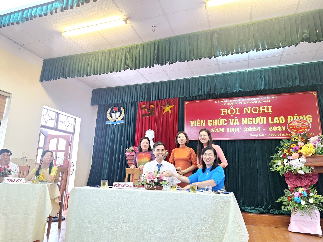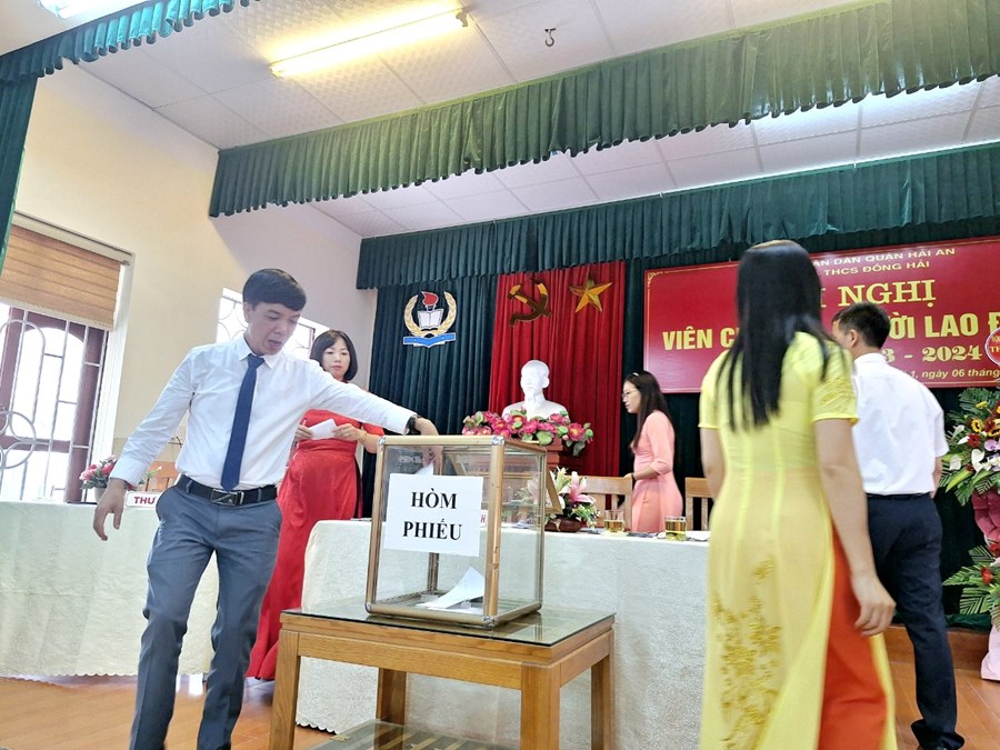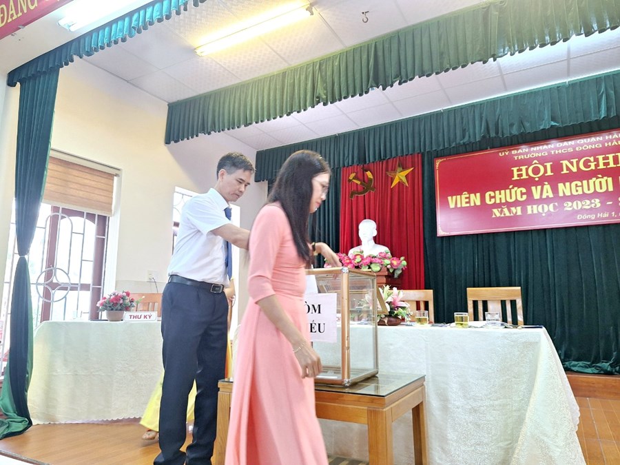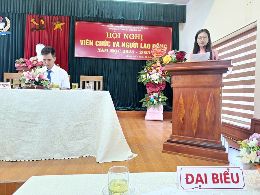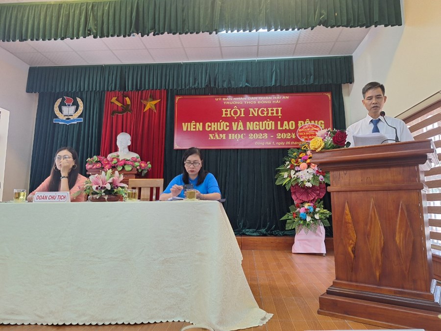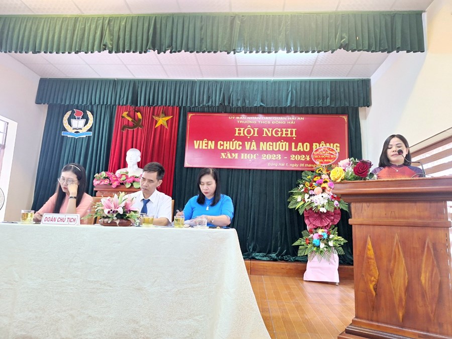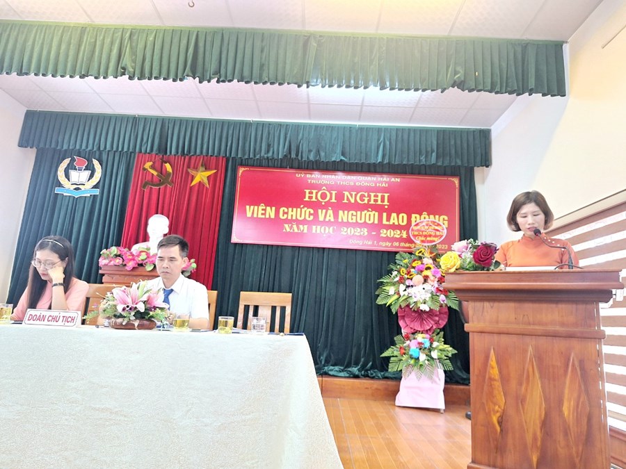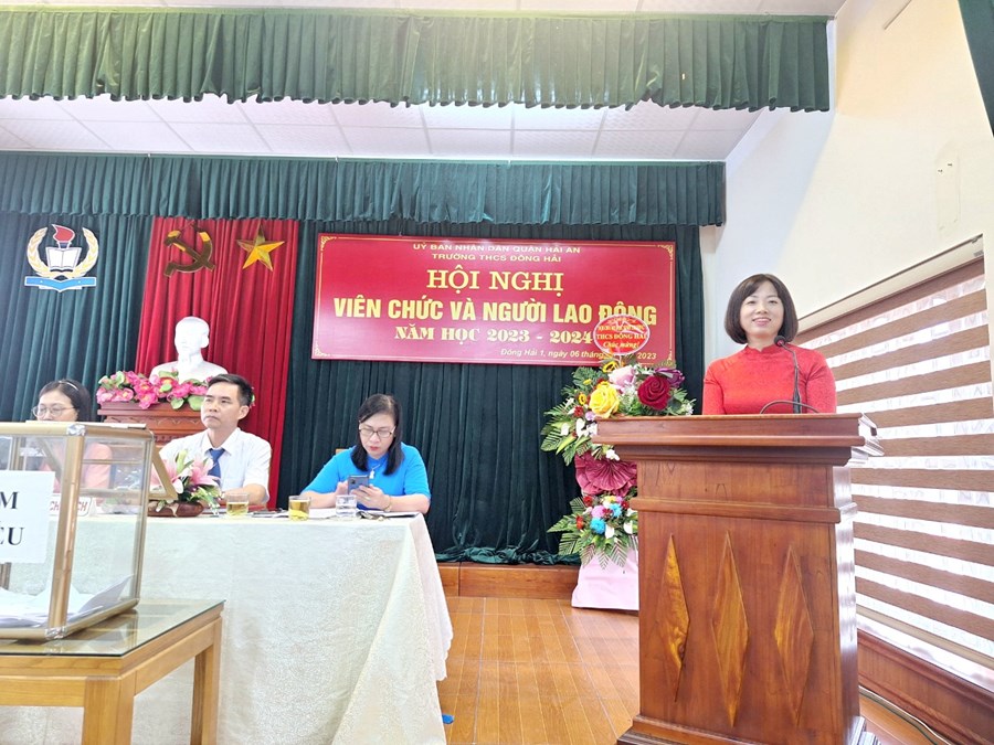 Thực hiện kế hoạch số 2159 -UBND&LĐLĐ ngày 31 tháng 8 năm 2023 của Ủy ban nhân dân Quận Hải An về việc chỉ đạo tổ chức Hội nghị viên chức và người lao động các đơn vị Giáo dục năm học 2023-2024. Thực hiện kế hoạch của nhà trường; ngày 06/10/2023, trường THCS Đông Hải- quận Hải An đã long trọng tổ chức “Hội nghị cán bộ, công chức, viên chức; Hội nghị người lao động năm học 2023-2024 nhằm đánh giá những kết quả đã đạt được trong năm học 2022-2023 đồng thời đề ra phương hướng, nhiệm vụ, giải pháp và các chỉ tiêu năm học 2023-2024. Đây cũng là một hoạt động quan trọng nhằm phát huy quyền làm chủ của cán bộ, giáo viên, nhân viên nhà trường từ đó đề xuất ý kiến, bày tỏ nguyện vọng đối với Ban giám hiệu nhà trường để góp phần xây dựng nhà trường ngày càng vững mạnh.