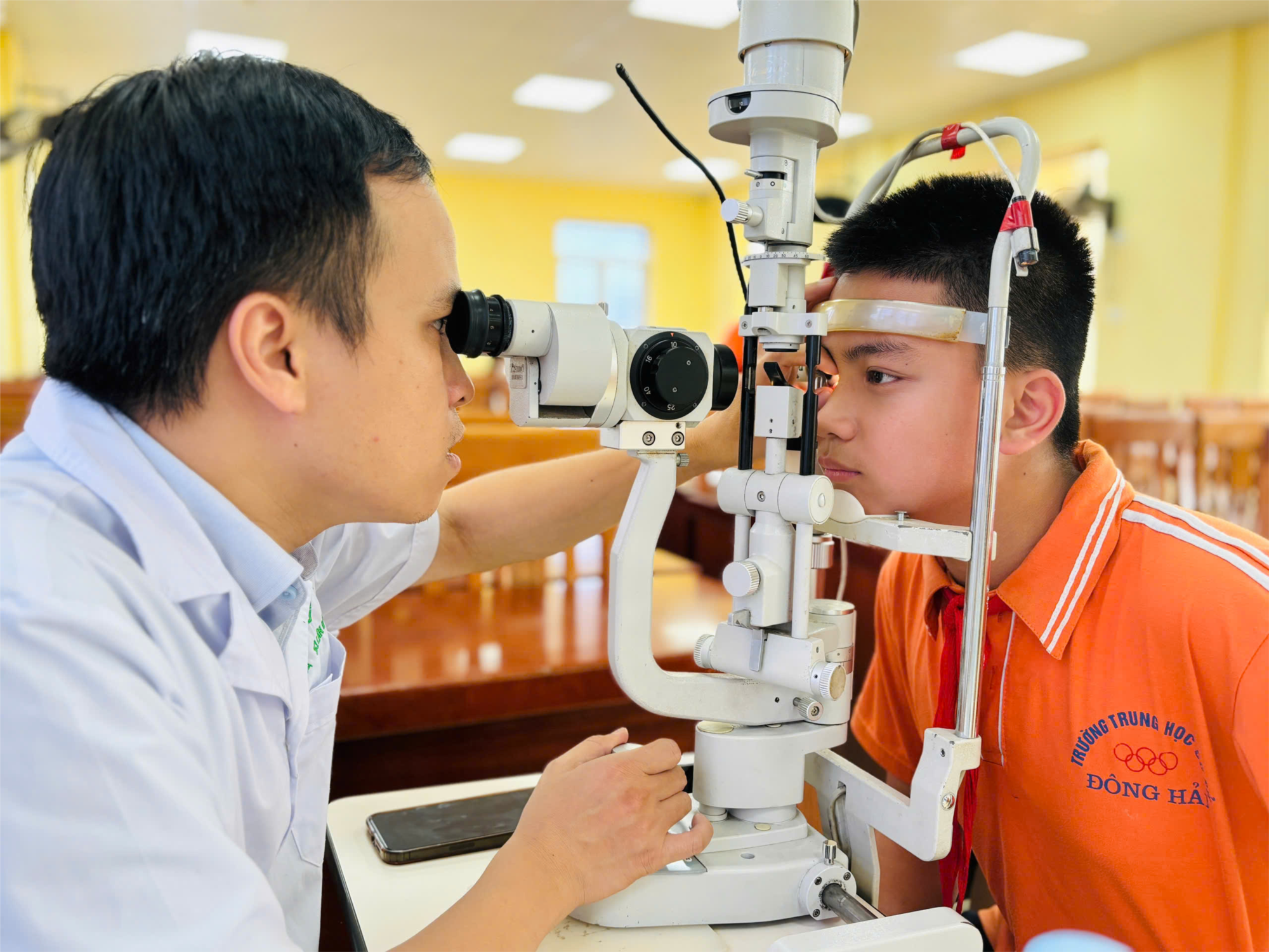 Ngày 07/10/2025, trường THCS Đông Hải kết hợp cùng Viện mắt Hải Phòng và phòng khám răng tổ chức khám mắt, khám răng cho các em học sinh trong toàn trường. Kiểm tra việc chăm sóc vệ sinh răng miệng của học sinh, đánh giá chính xác tình trạng thị lực, phát hiện đúng các bệnh lý tại mắt để điều trị kịp thời. Toàn bộ quá trình đo, kiểm tra, thăm khám đều được thực hiện trên hệ thống trang thiết bị hiện đại và chính xác bởi đội ngũ bác sĩ và kỹ thuật viên giàu kinh nghiệm. Qua thăm khám, một số học sinh mắc các tật khúc xạ nhưng lại không đeo kính thường xuyên, một số học sinh đeo kính nhưng lại không đúng số do đo và cắt kính chưa chuẩn nên các cháu đeo kính mà không đạt được thị lực tối đa. Bên cạnh đó các bác sỹ cũng phát hiện một số trường hợp bệnh lý như viêm kết mạc, canci kết mạc, u kết mạc, sụp mi. Từ đó đưa ra kết quả đề nghị phụ huynh cần đưa con đến cơ sở uy tín chuyên khoa mắt để khám chuyên sâu. Chăm sóc sức khỏe, phòng chống bệnh học đường là nội dung quan trọng luôn được nhà trường quan tâm. Hãy cùng nhau hành động vì đôi mắt sáng cho trẻ em.