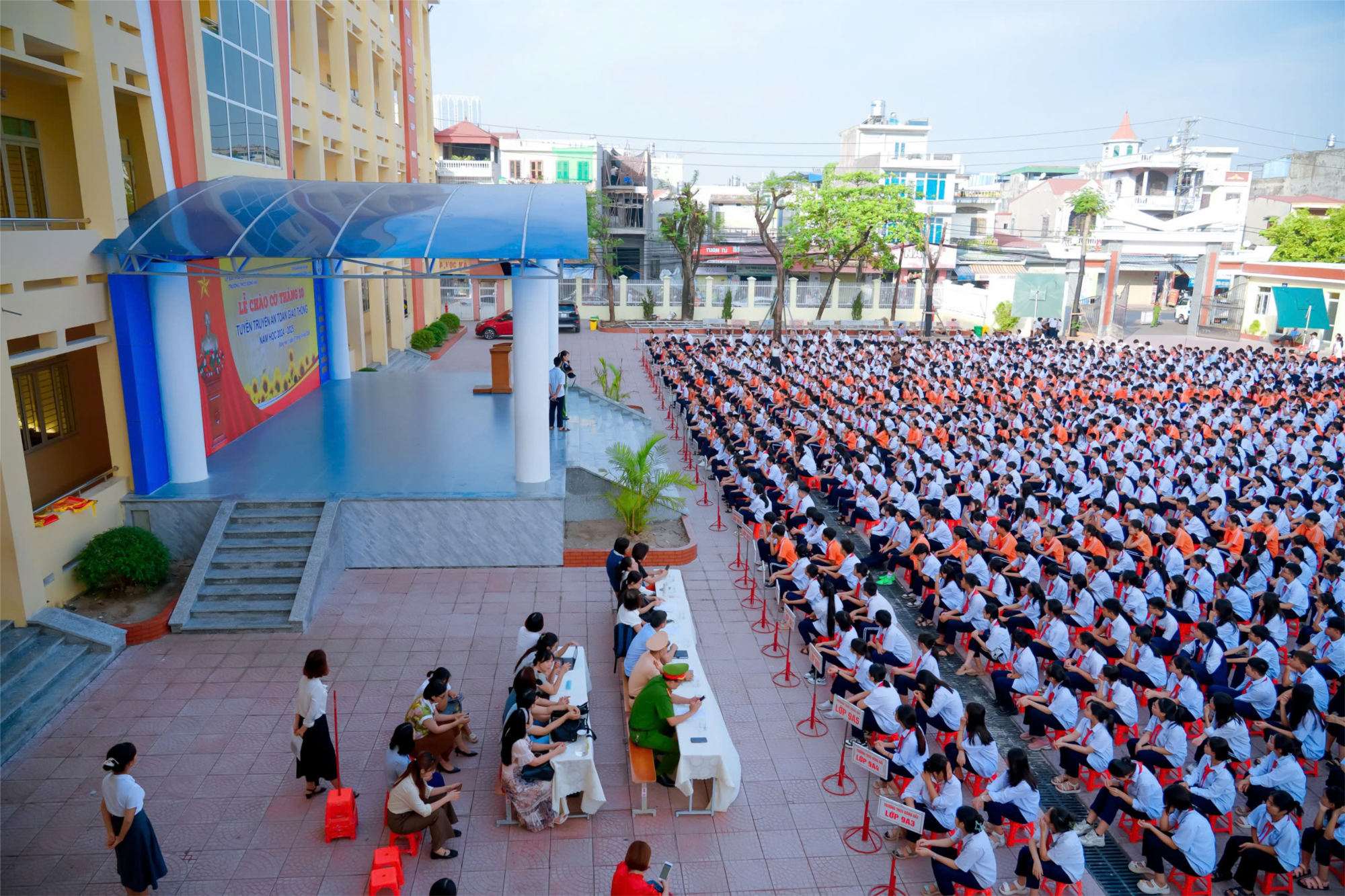 Sau phần nghi lễ Chào cờ, Đại úy Nguyễn Lê Cẩm Dung cán bộ Đội cảnh sát giao thông trật tự công an quận đã có các thông tin tuyên truyền vô cùng thiết thực, bổ ích đối với các em học sinh toàn trường. Trong đó có nội dung hướng dẫn cách đội mũ bảo hiểm, các câu hỏi về an toàn giao thông và các hình thức xử phạt nếu học sinh vi phạm. Trong đó nhấn mạnh học sinh đi xe đạp điện, hoặc ngồi sau xe máy, xe máy điện của phụ huynh chở phải đội mũ bảo hiểm cài quai đúng quy cách. Học sinh lứa tuổi THCS chưa đủ tuổi đi xe máy điện nên tuyệt đối không học sinh nào được điều khiển xe máy điện.