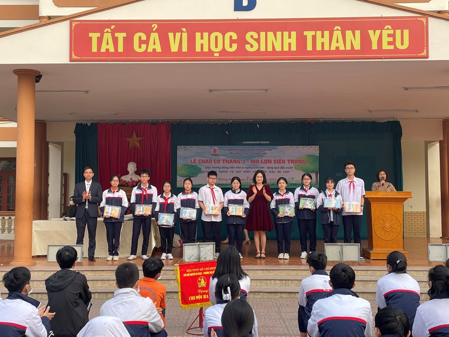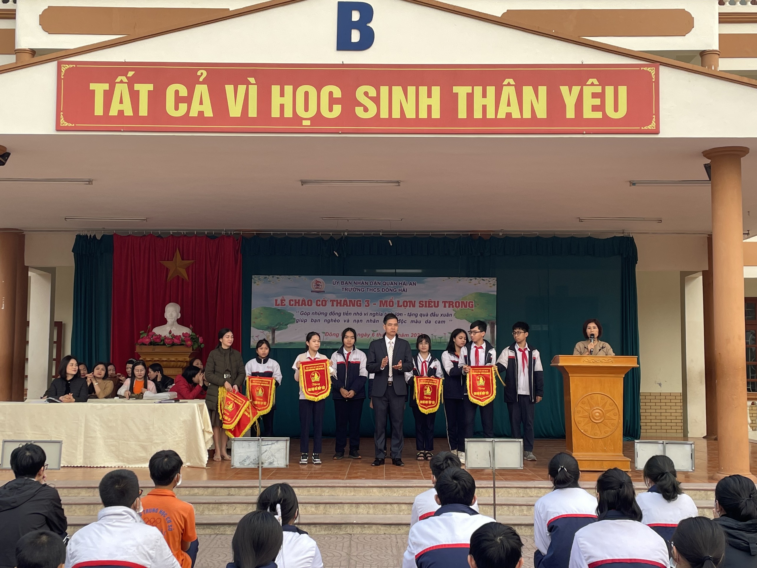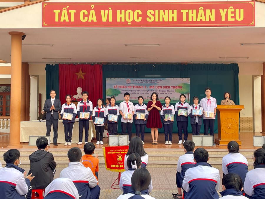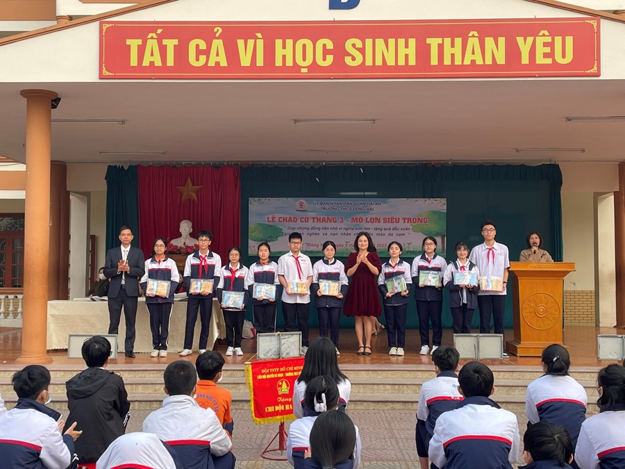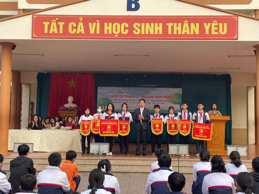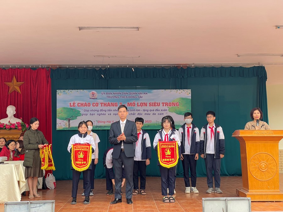 Tham dự chương trình có Ban giám hiệu nhà trường, giáo viên Tổng phụ trách, các thầy cô giáo chủ nhiệm và 2243 học sinh toàn trường. Trong chương trình giáo viên TPT đã đánh giá các hoạt động, biểu dương các chi Đội đứng đầu nhận cờ thi đua: Học tập tốt, nề nếp tốt, phong trào tốt, Chi Đội 3 tốt. Khen thưởng 10 học sinh lớp 9 có kết quả xuất sắc trong kỳ thi khảo sát chất lượng tháng 2. Chương trình “Tết ấm cho em” đã tặng 93 suất quà Tết cho học sinh có hoàn cảnh khó khăn tại trường, tặng 7 suất quà tới làng trẻ Hoa Phượng, 15 suất quà làng trẻ SOS, 10 suất quà tham gia chương trình “Tình nguyện mùa Đông 2022- xuân tình nguyện 2023 cùng Thành Đoàn tặng học sinh khó khăn tại đảo Cát Hải. Tham gia chương trình “Ngày hội gói bánh chưng” cùng Quận Đoàn tặng làng trẻ mồ côi Hoa Phượng 60 cái bánh chưng. Tiếp tục trong tháng 3 là các hoạt động tặng sân chơi cho nhà trẻ trên đảo Bạch Long Vỹ, tặng 10 suất quà nuôi lợn siêu trọng cho 10 học sinh có hoàn cảnh đặc biệt. Hỗ trợ thường xuyên 2 học sinh mồ côi mỗi tháng 1 triệu đồng/1 học sinh từ nay đến hết lớp 9 khi các em ra trường. Trong nhiều năm học qua, phong trào nuôi lợn siêu trọng luôn được các em học sinh trường THCS Đông Hải đón nhận và tham gia tích cực. Thể hiện được nghĩa cử cao đẹp “Góp những đồng tiền nhỏ vì nghĩa tình lớn”. Chúc cho tình yêu thương, lòng nhân ái rộng khắp nhân gian này.
