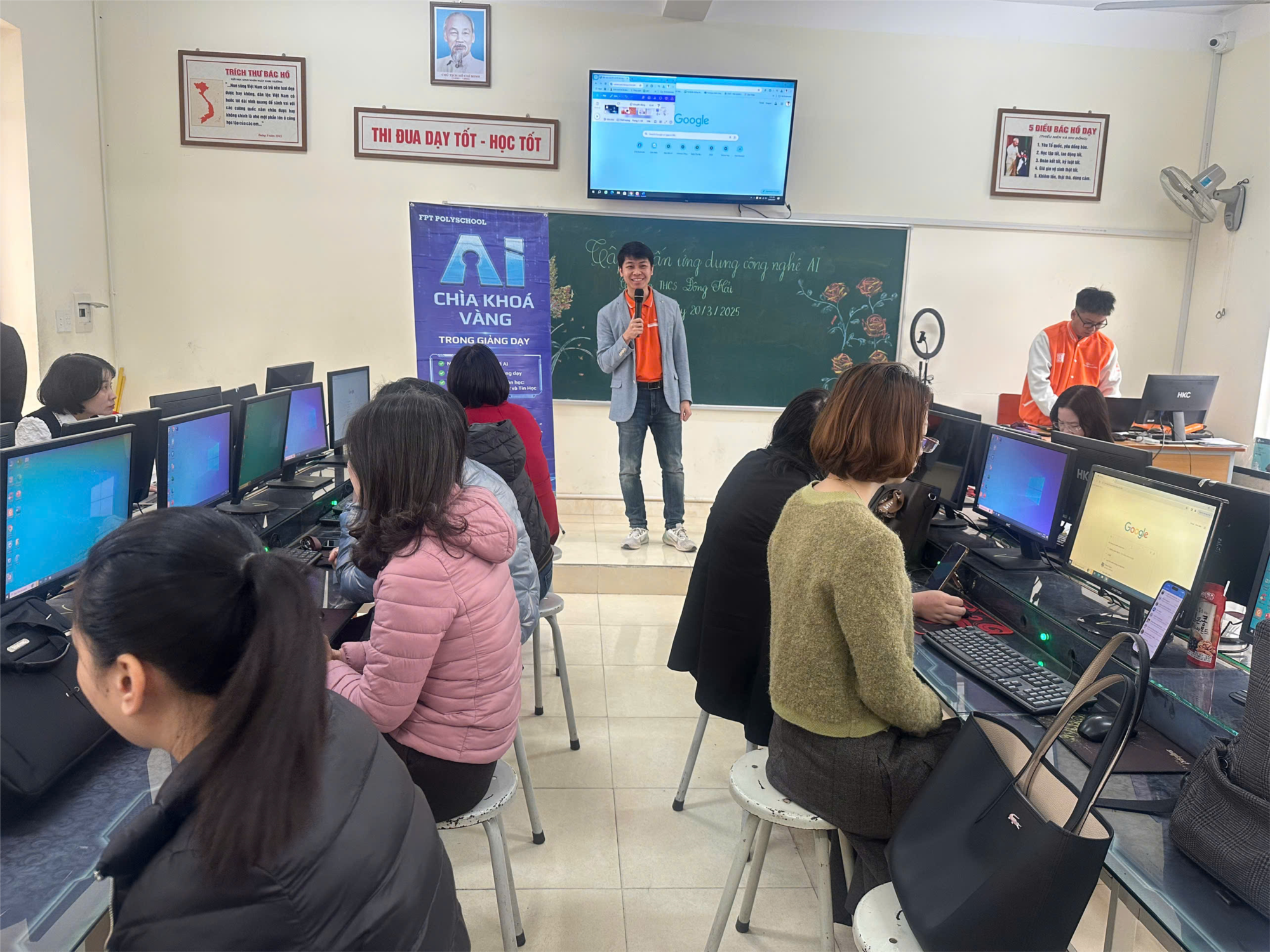 Ngày 20/3/2025, trường THCS Đông Hải tổ chức cho 100% các đồng chí cán bộ, giáo viên tập huấn ứng dụng công nghệ AI. Dạy học bằng AI là việc sử dụng trí tuệ nhân tạo như một công cụ giáo dục, hỗ trợ cho việc dạy và học. AI có thể tự động hóa các nhiệm vụ như chấm điểm, cung cấp phản hồi và viết nên tài liệu giảng dạy, giúp thầy cô giảm bớt gánh nặng công việc, tiết kiệm thời gian và tăng cường hiệu quả của quá trình giảng dạy. Trí tuệ nhân tạo có thể hỗ trợ giáo viên rất nhiều trong việc lập kế hoạch bài học, chuẩn bị bài giảng. Những bài giảng tương tác, bài tập đa dạng và phong phú do AI gợi ý cho thầy cô có thể giúp học sinh trải nghiệm học tập theo cách đa dạng và thú vị hơn.