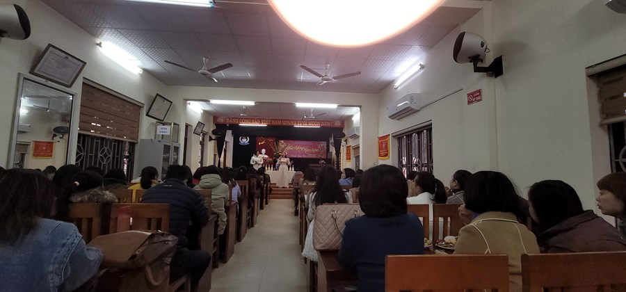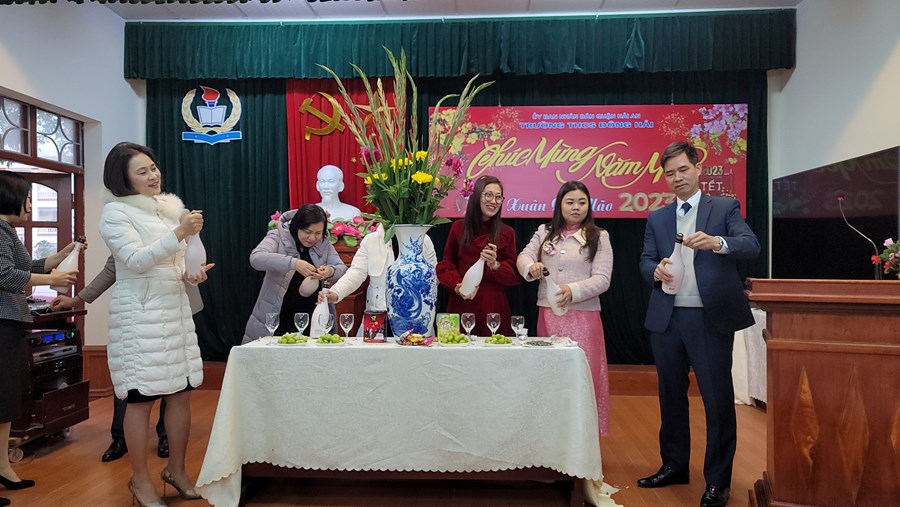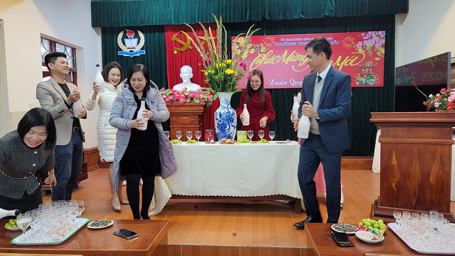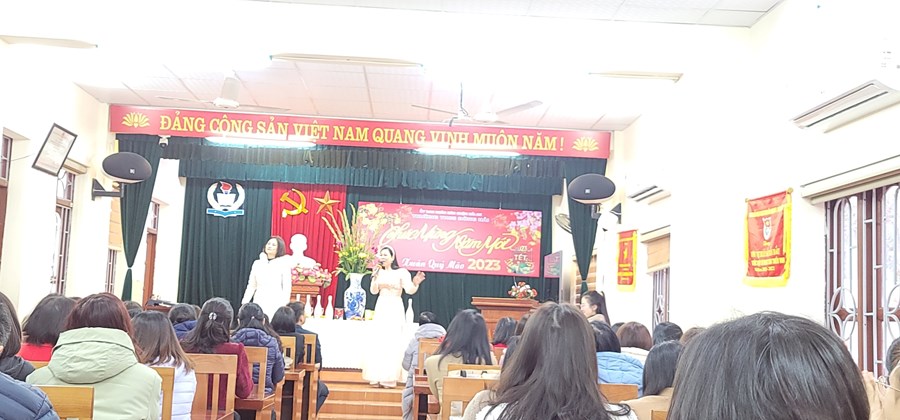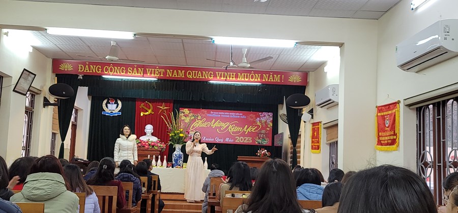Trong buổi tiếp xúc đầu Xuân, Đ.c Vũ Thị Thu Hằng và Trần Thị Thắng đã gửi tới tập thể CB-GV-NV nhà trường những lời ca tiếng hát ngọt ngào chào mùa Xuân mới. Đồng chí Phạm Hồng Khánh- Bí thư Chi bộ, hiệu trưởng nhà trường phát biểu chúc Tết.