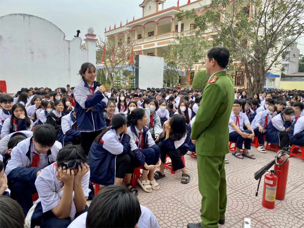 Trong chương trình thầy cô và và các em học sinh đã được lắng nghe Đại úy Bùi Hồng Mạnh trao đổi các nội dung cơ bản của pháp luật về bảo đảm trật tự ATGT; Thượng úy Mai Văn Quảng chia sẻ kỹ năng phòng cháy chữa cháy; Trung Úy Vũ Minh Tuấn tuyên truyền nội dung cơ bản về công tác quản lý vũ khí, vật liệu nổ, công cụ hỗ trợ, pháo và phòng chống bạo lực học đường. Buổi tuyên truyền được các em học sinh hào hứng đón nhận. Đây thực sự là hoạt động bổ ích và thiết thực trong công tác giáo dục pháp luật cho học sinh đảm bảo an toàn an ninh trường học.