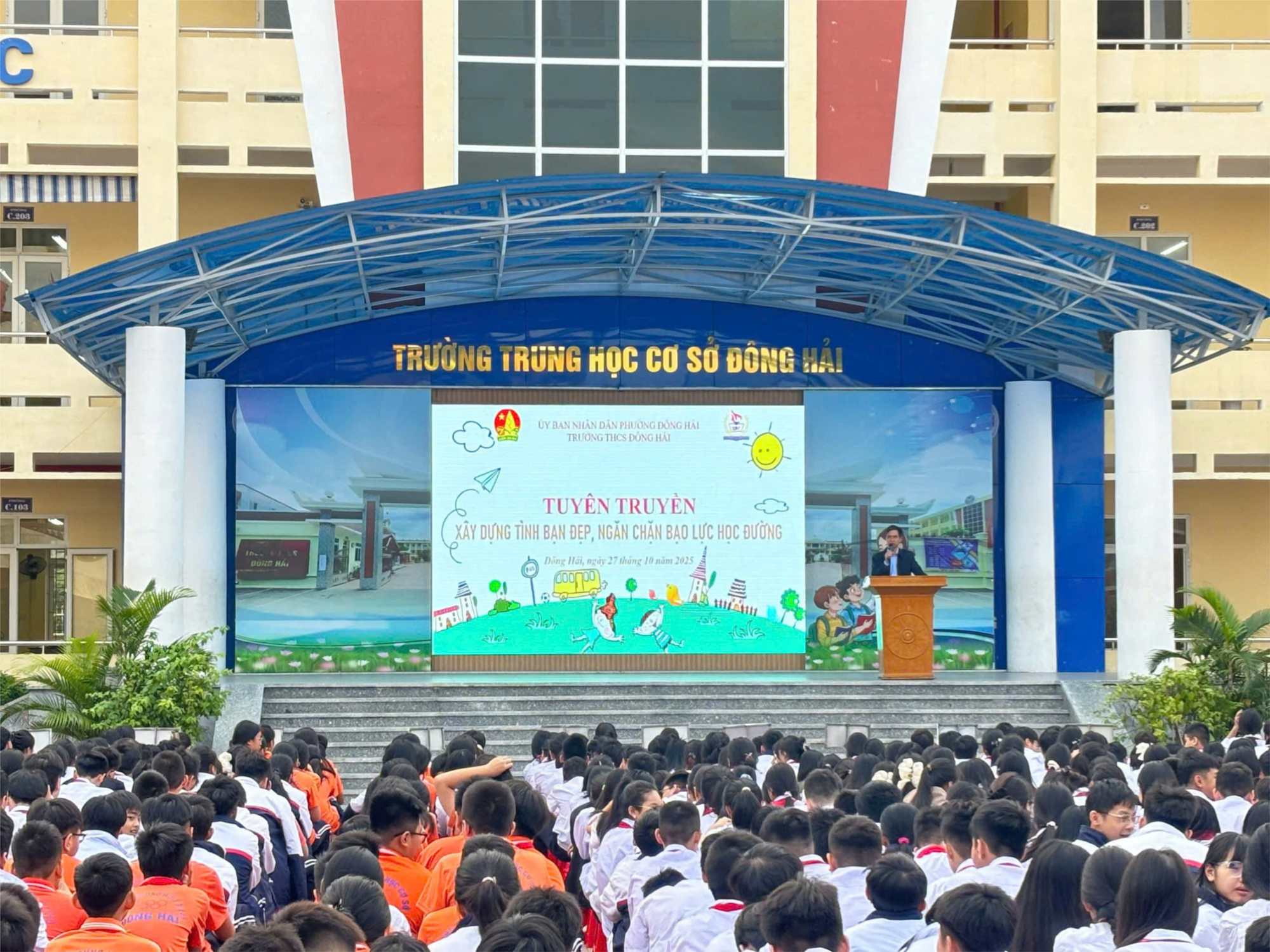 Ngày 27/10/2025 trường THCS Đông Hải tổ chức tuyên truyền “Xây dựng tình bạn đẹp, ngặn chặn bạo lực học đường” tại sân trường. Tham gia chương trình có thầy giáo Phạm Hồng Khánh- Hiệu trưởng nhà trường, cô giáo Trần Thị Thắng- Phó HT, các thầy cô giáo và 2290 học sinh toàn trường. Nhằm thực hiện hiệu quả công tác an toàn an ninh trường học, tuyên truyền, phổ biến, giáo dục pháp luât, xây dựng tình bạn đẹp, nói không với bạo lực học đường. Với những chia sẻ gần gũi và chân thực, chương trình đã giúp các em học sinh hiểu và gọi tên những hành vi bạo lực nơi học đường. Từ đó các bạn học sinh cũng ý thức hơn về hành vi của bản thân, bớt đi những trò đùa vui quá trớn. Cũng trong chuyên đề, tuyên truyền thực hiện 3 nguyên tắc đặc biệt tạo nên một tình bạn đẹp đó là: Giúp đỡ - tha thứ - tôn trọng! Trên thực tế, bạo lực học đường không phải một vấn đề mới nhưng luôn cần sự quan tâm đặc biệt bởi không chỉ để lại những vết thương trên cơ thể, thứ đáng sợ nhất mà bạo lực học đường để lại là những vết sẹo nơi tâm hồn, những ám ảnh tâm lý lâu dài trong tâm trí mỗi học sinh. Thông qua chương trình, bồi dưỡng cho học sinh những cảm xúc tích cực, vun đắp tình bạn đẹp và ý thức về giá trị của tình bạn trong môi trường giáo dục; trang bị cho học sinh cách ứng xử phù hợp để bảo vệ bản thân, chủ động ngăn chặn, đấu tranh với các hành vi bạo lực, góp phần xây dựng một môi trường học tập an toàn, lành mạnh.